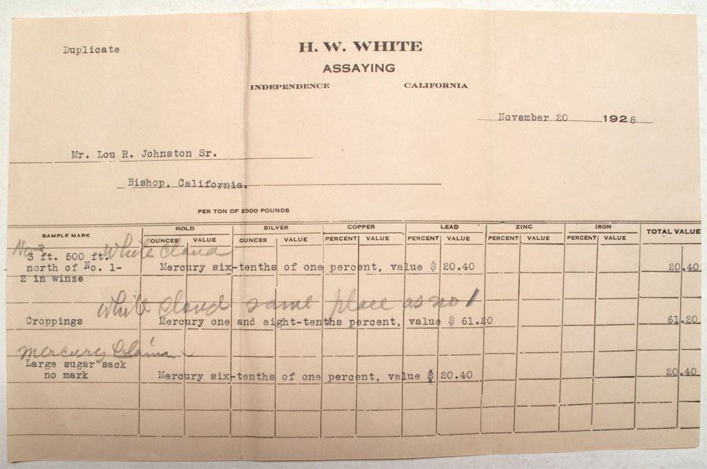 H. W. White, Assaying. 1928. Values from $61.20 to $20.40. All in Mercury. Date 1928 Independence, CA hwac 3724