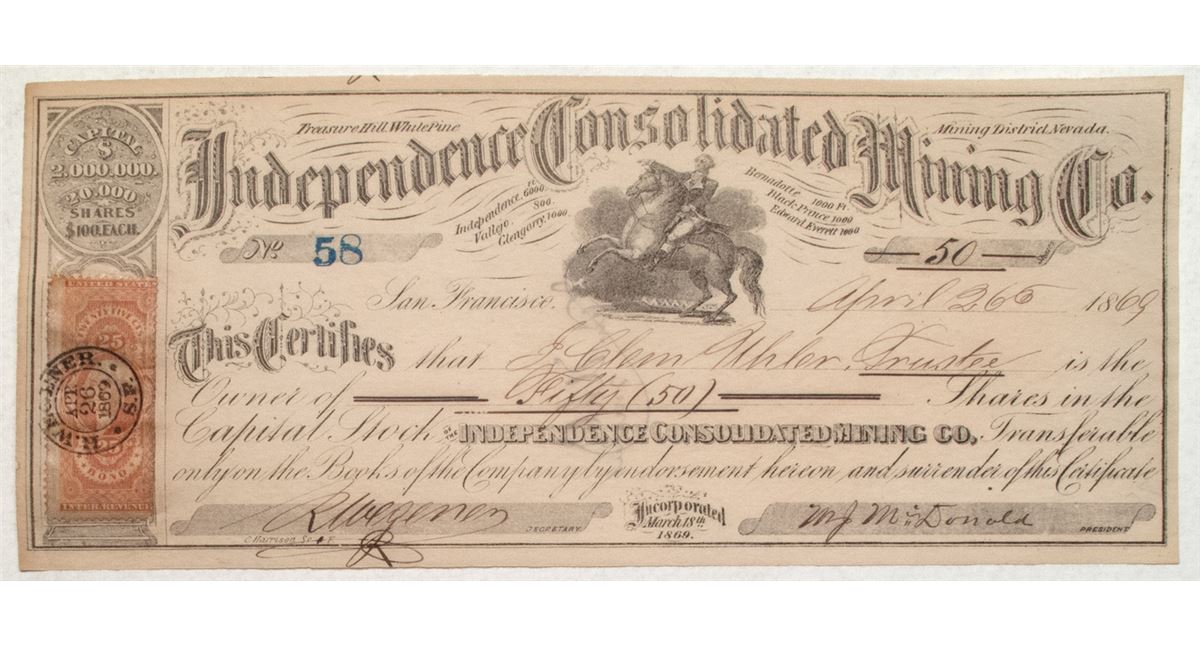 Number 58 Issued in 1869 to G. Clem Uhler for 50 shares at $100 each. Endorsed on reverse. Signed by M.J. McDonald as president. Treasure Hill White Pine Mining District, Nevada printed on the top. The company’s claims are listed at the top: Independence- 6000 ft., Vallejo- 800 ft. , Glengarry- 1000 ft., Bernadette- 1000 ft., Black Prince- 1000 ft. and Edward Everett- 1000 ft. By 1868, Treasure Hill had mining rushes and the population swelled to 6,000. In less than two years time, over 13,000 claims were located on Treasure Hill; most of them were never worked. Probably as much as $20 million in silver was mined by 1880 (Paher). Twenty-five cent revenue stamp affixed at the lef.t