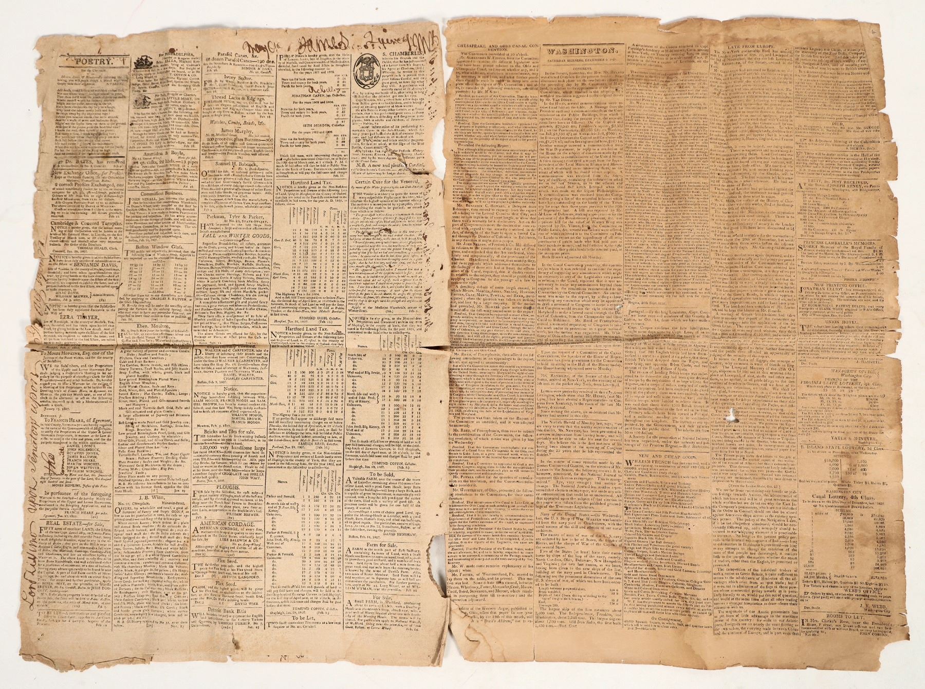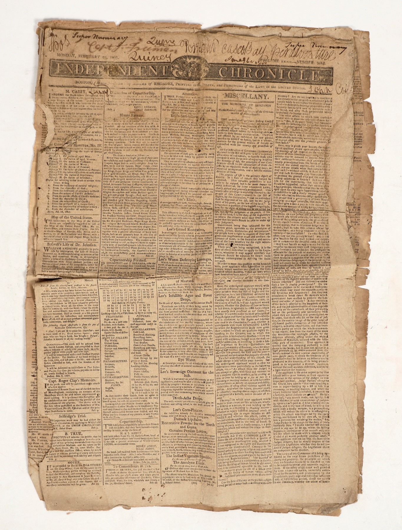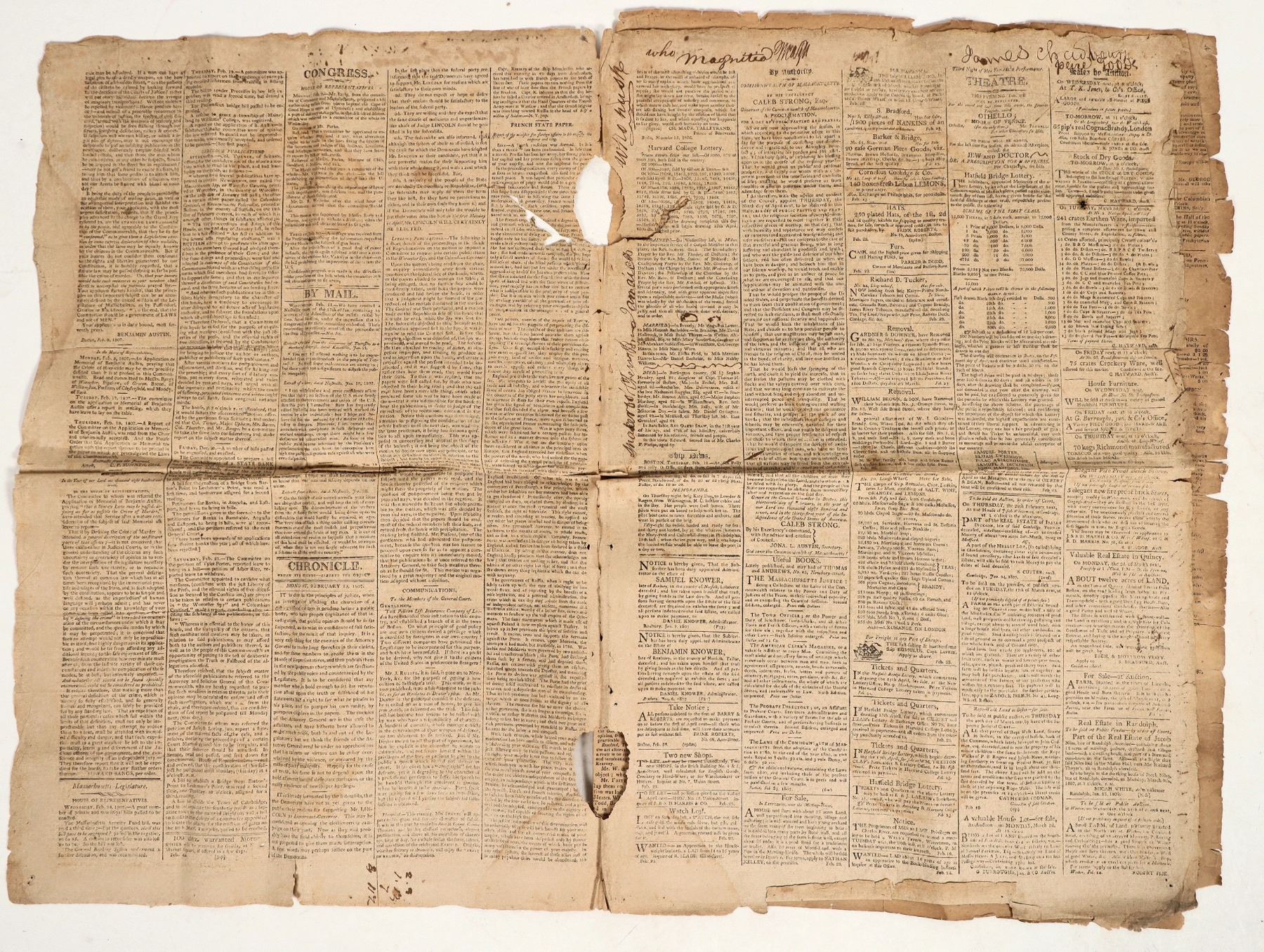 Super early edition, February 23rd, 1807. Adams & Rhoades, publishers. 6pp. 21 x 15" Last two pages detached. Paper is very fragile, with rips, a few holes, and stains. The Independent Chronicle was a prominent Boston newspaper founded in 1768 as The Essex Gazette before relocating and becoming The Independent Chronicle in 1776, aligning itself strongly with the Patriot cause during the American Revolution. It played a significant role in shaping public opinion in Massachusetts through the late 18th and early 19th centuries, often publishing radical and anti-Federalist views. The paper eventually merged with other publications and ceased independent publication in the early 1840s, leaving behind a legacy as one of the most influential revolutionary-era newspapers in New England.