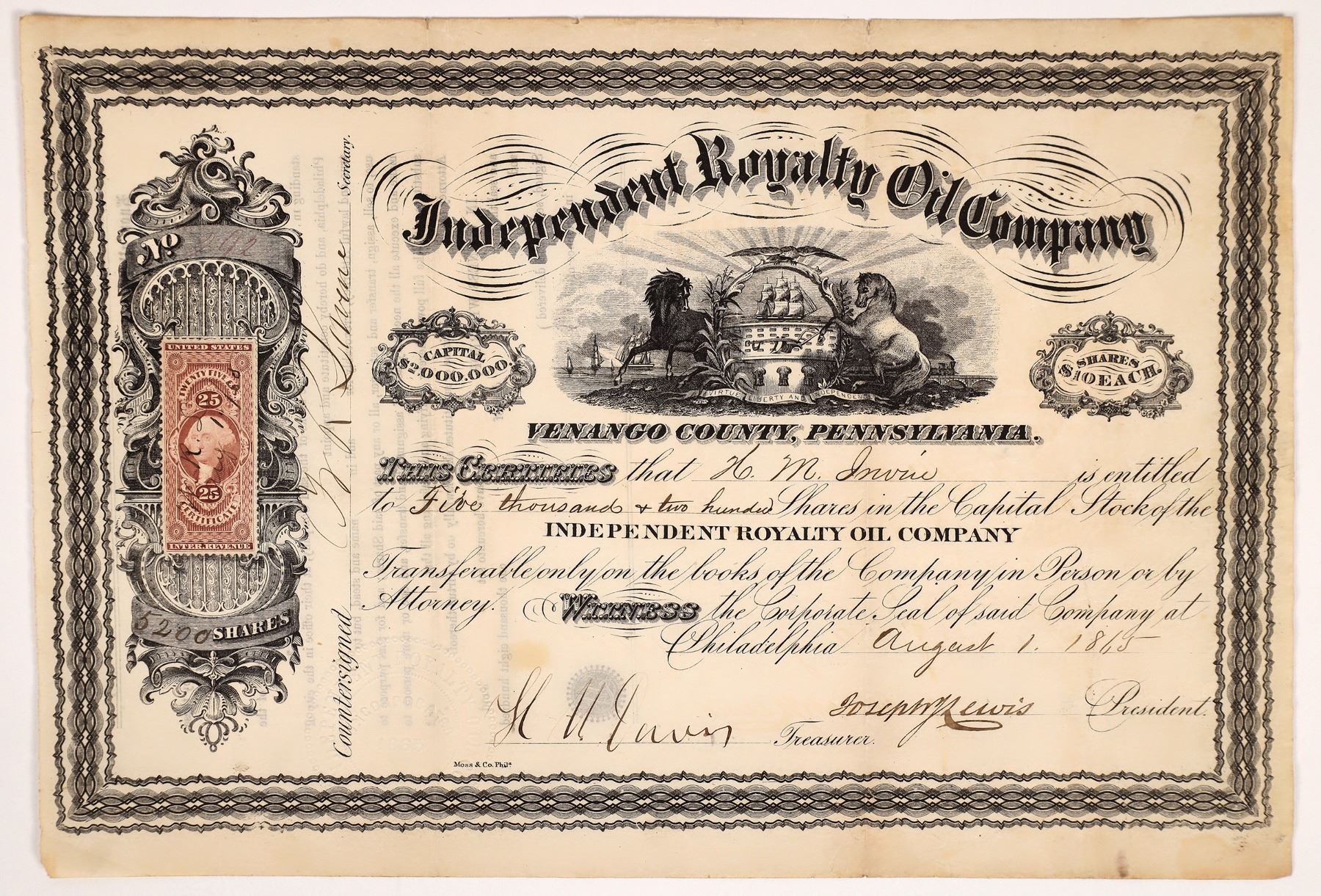 "Venango County, Pennsylvania" printed under vignette. No. 292, issued for 5,200 shares to treasurer HM Irwin in Philadelphia in 1865. Signed by president Joseph Lewis and Irwin and the secretary. Not cancelled. Vignette of state seal. 25 cent US IR certificate stamp. Folds, toning and some stains. 7.75 x 11.25" Printed by Moss & Co., Philadelphia.