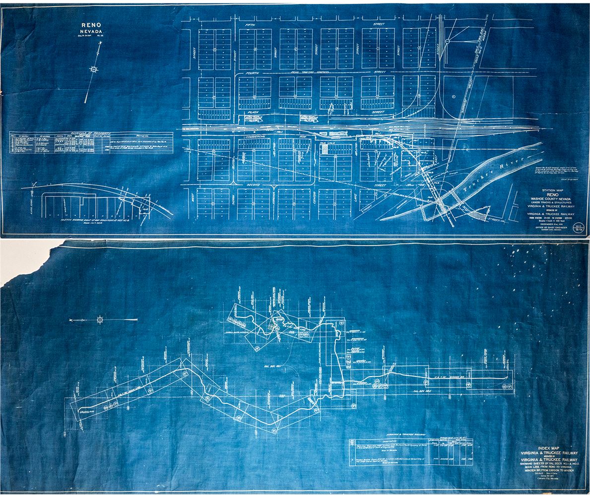 Index map from the Virginia & Truckee Railway showing sheets of val. secs. no. 1 and no. 2 mainline from Reno to Virginia City and Minden Br. from Carson City to Minden,June, 1912. Station map, Reno, Washoe County, NV: lands, tracks and structures. Virginia & Truckee Railway operated by V & T Railway from station 0 + 00 to station 22 + 02, Dec. 1916. Office of Chief Engineer. The Virginia and Truckee Railroad (reporting mark VT) was built to serve the Comstock Lode mining communities of northwestern Nevada. At its height, the railroad's route ran from Reno south to Carson City, Nevada. In Carson City, the mainline split into two branches. One branch continued south to Minden, while the other branch traveled east to Virginia City. The first section constructed from Virginia City to Carson City was constructed commencing in 1869 to haul ore, lumber and supplies for the Comstock Lode.