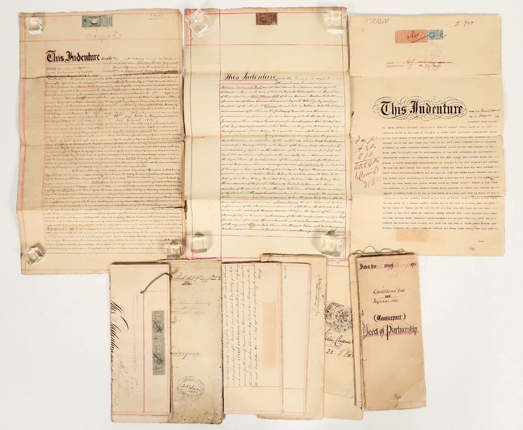 Lot of 6. Conveyance and Partnership papers from India w/ revenue stamps. 1857-1912. All are in poor conditionl