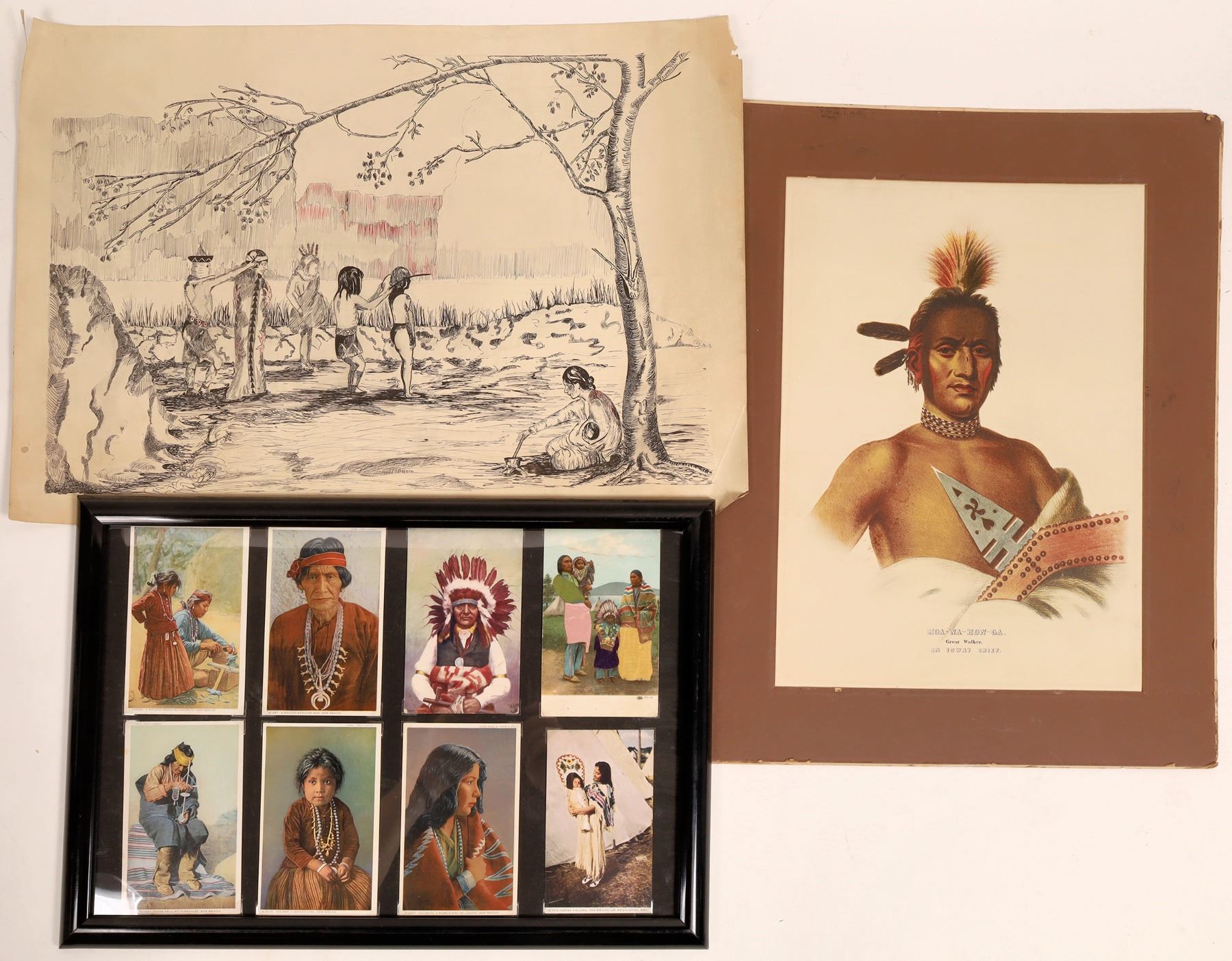 This lot contains three separate items of Indian life in art. The first print is a block print by Bainbridge Drawing Bristol embossed on the back at 15 in. X 22 in. some corner wear. The second print is colorized of Moa-Na-Hon-Ga or "Great Walker" An Ioway Chief 1965 by Penn Prints, N.Y. P2537 matted at 16 in. X 20 in. , in good condition. The last item is a collage of eight (8) postcards of Indians of various tribes properly corner mounted and framed at 19 in. X 13 in. very good condition.