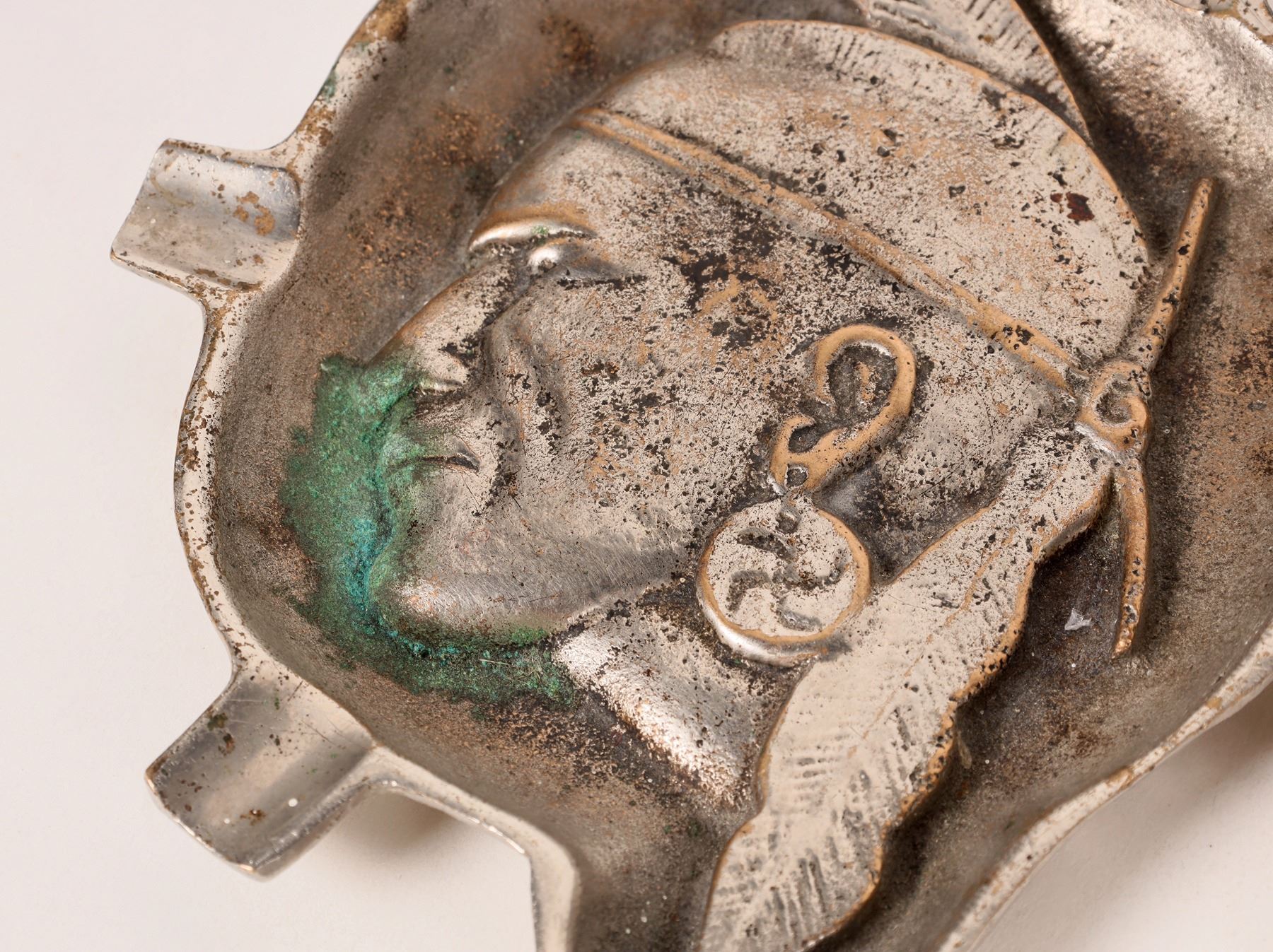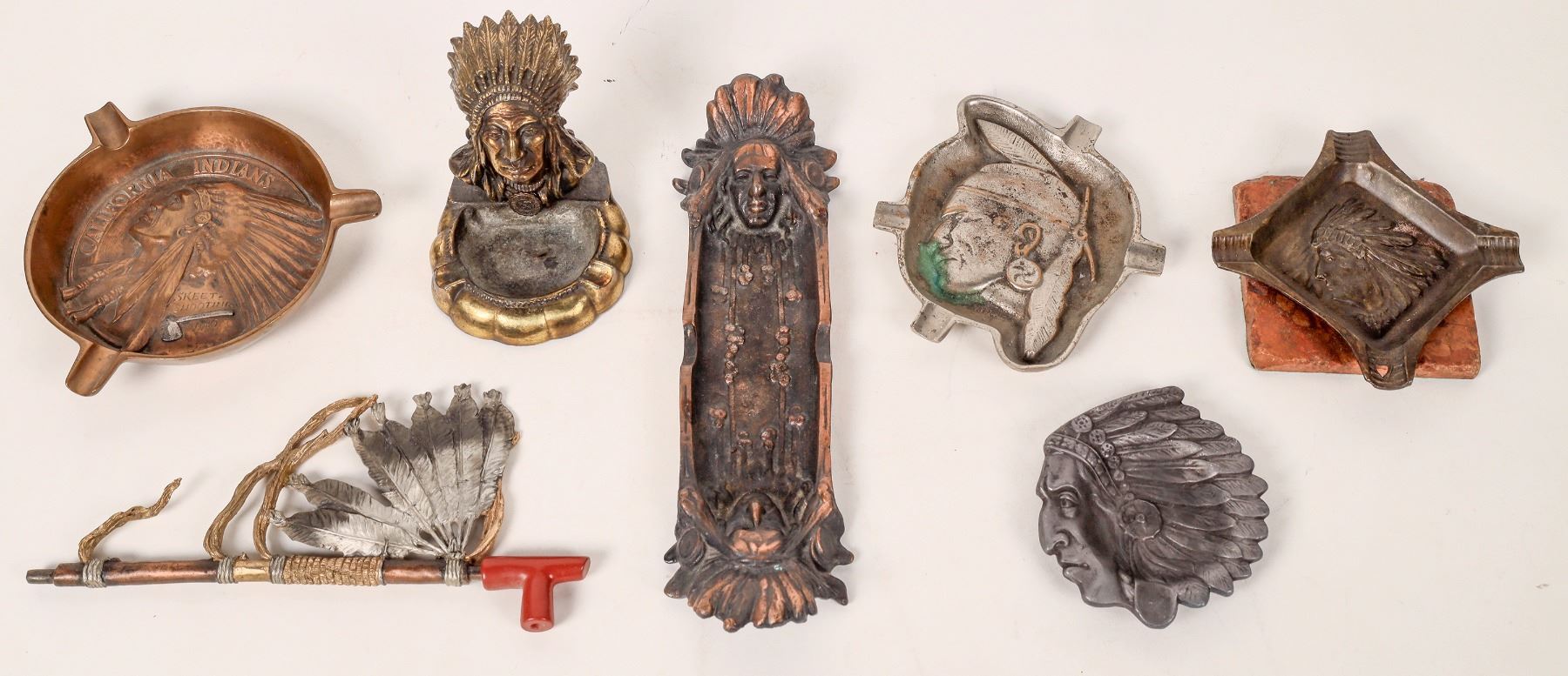 Indian ashtray designs were big in the 1950s, so here's a group of six, plus a small metal decoration with pipestone. One of the trays celebrates the 1953 Boy Scout Jamboree, while another commemorates the California Indians. All in nice condition. Please see photos for more details. 1953