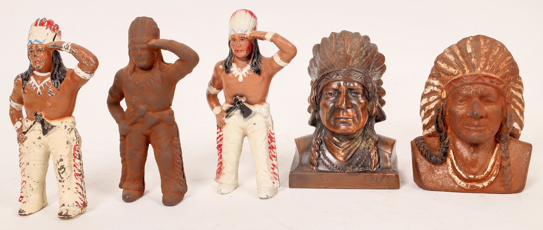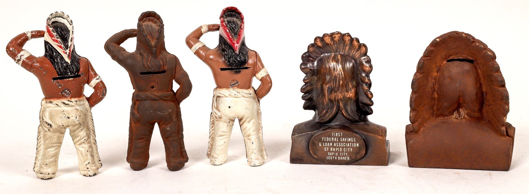 Indian themed coin banks (5). Two are head shots, one made of cast iron, the other, brass. They both measure about five inches. The other three are in a standing pose and stand 6" high. Two are painted, the other stripped. Two appear to be made from cast iron, while the other is froma much lighter metal. Please see photos for more detail.