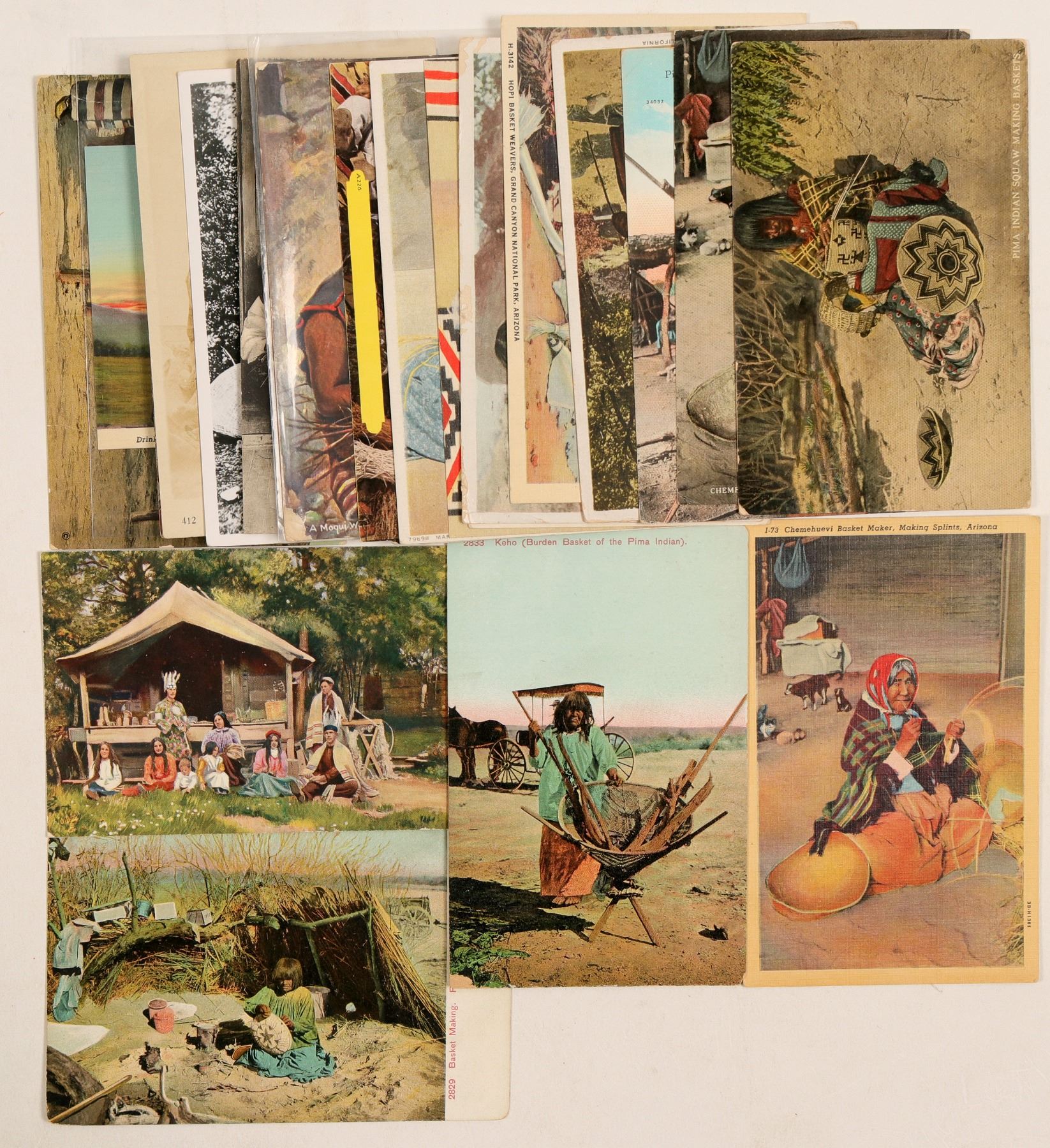 26 different, mainly colored postcards of baskets and basket weaving. Included are baskets from Cohouilla, Apache, Supai, Hope and Pima tribes. Used for personal use, ceremonies, sale, gathering crops, grave marker and carrying water. Brian Thaler Collection