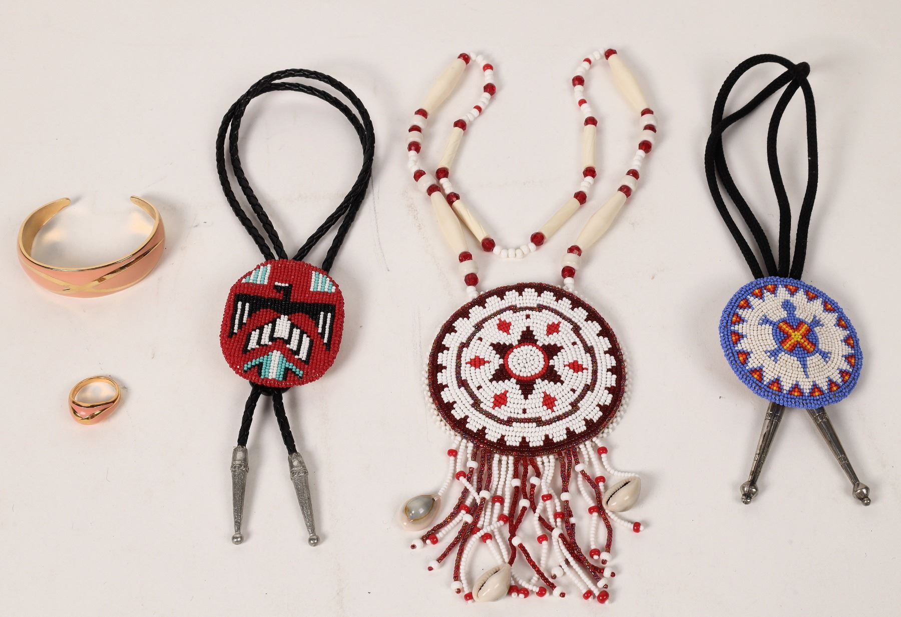Two beaded American Indian bolos, beautifully beaded, a hair pipe & seed bead necklace and a more contemporary coral ring with matching bracelet. All in nice condition. Please see photos for more detail.