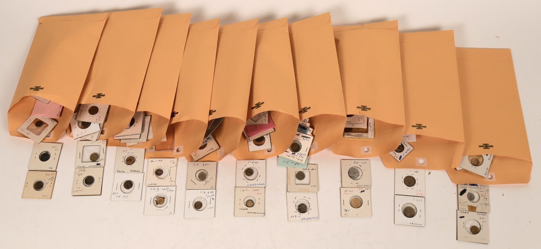 Large collection of $1 sized counters with American Indian on the obverse. The collection contains approximately 217 different varieties. Only 44 (18%) were made in a manner not resembling US gold coins. This collection is particularly interesting, and begs much more study. It might be suggested that most, if not all of these tokens were not made for gaming. Certainly many were made specifically for jewelry, in the same marketing manner some of the Breen-Gillio gold dollars were made. A number of these are dated: 1854, 1857, 1864, 1865, 1868. Overall, 34 varieties are dated (16%). One variety says "California". There are only ten silver plate or white metal varieties. Only 15 varieties use the phrase "Speil marke". 7 varieties are blank on the reverse, clearly jewelry pieces. Many have holes drilled in the top center for suspension from a bracelet or other jewelry piece. A few have two holes drilled- one on top, and another at bottom, indicating the use as a chain. Several are clearly late-made pieces (post-1900) compared to the early pieces.