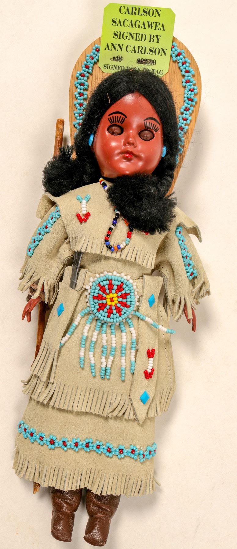 Kachina in Glass Case, signed by artist R. Begay. 6"x"5"x 10". Excellent condition. Sacagawea doll with baby basket on her back, signed by artist Ann Carlson. Excellent condition. A collector's item. Not a toy. 11" length. State: City: Date: