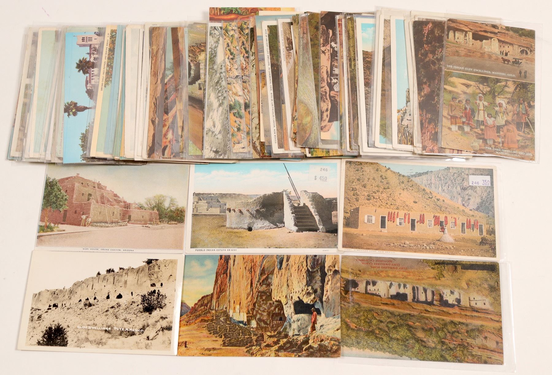 Over 100 mainly colored postcards of Indian Dwellings / Huts / Bldgs / Architecture with few duplicates. Many examples of different kinds of Indian building such as / cliff dwellings, in Manitou, Colorado, North Wall Ruins in Frijoles Canyon, N.M., 700 - 1000 A.D. Mesa Verde people built dwellings of masonry and Montezuma's Castle, Northern Arizona.