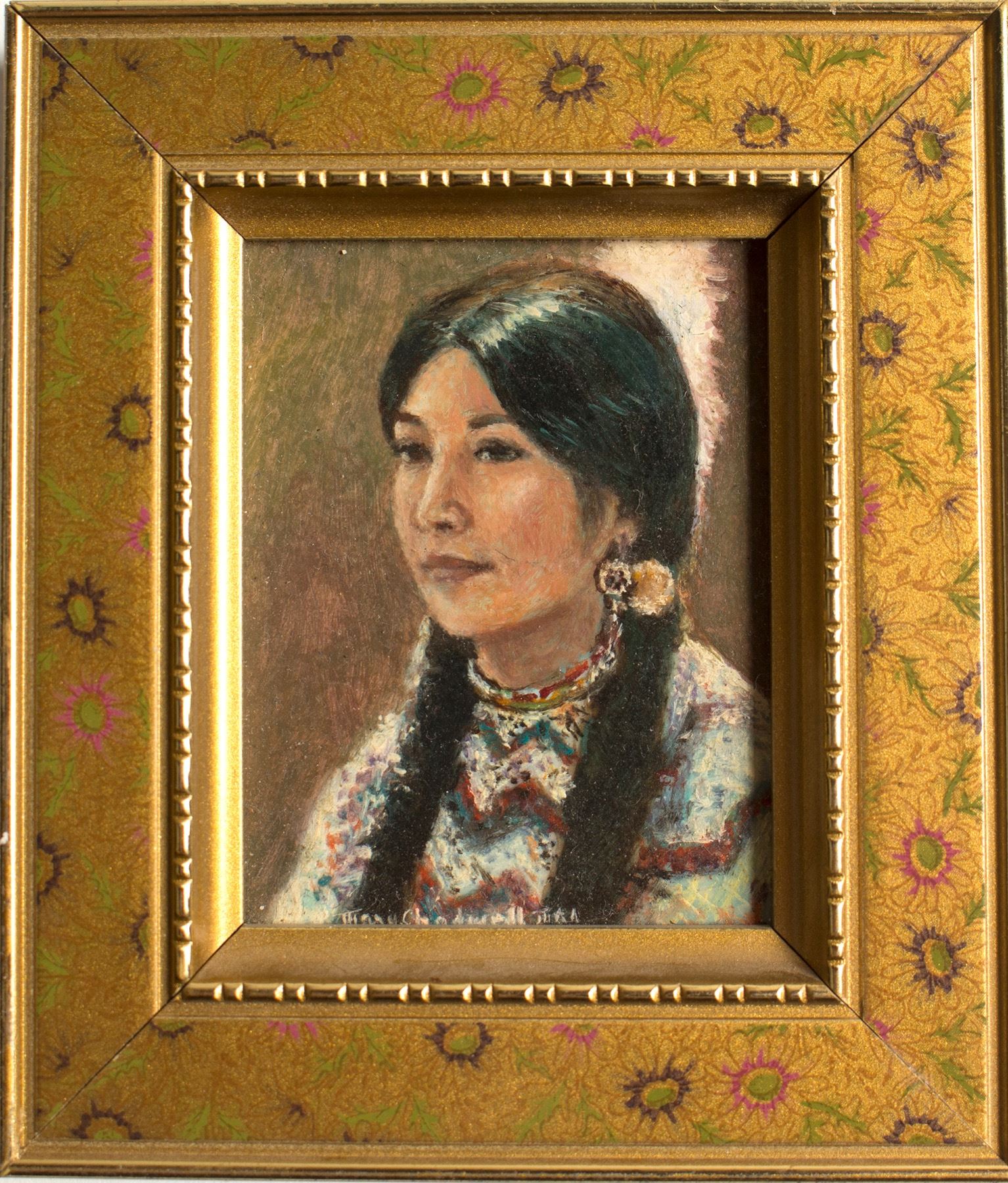 Indian Girl by Mary Chadwell. Miniature oil painting, 2" x 1.5", framed 3.5" x 3". State: Nevada City: HWAC#: 48005 Date: