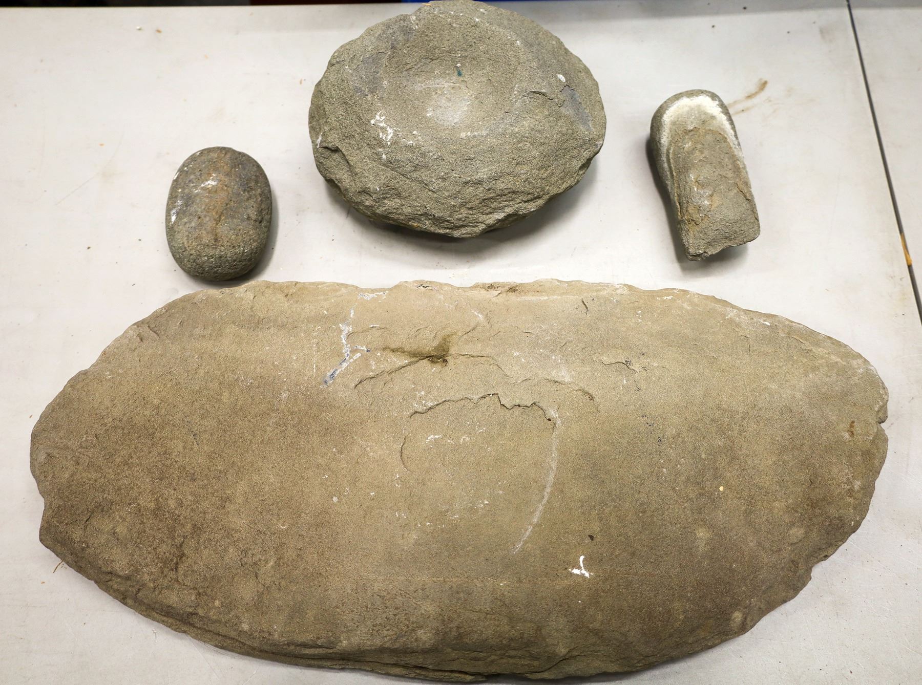 First one is 13 x 24 x 3 inches and 2nd one is 10 x 8 x 5 inches. Grey stone. These stones were found along the banks of the Kern River while discing fields near Bakersfield about 1950.