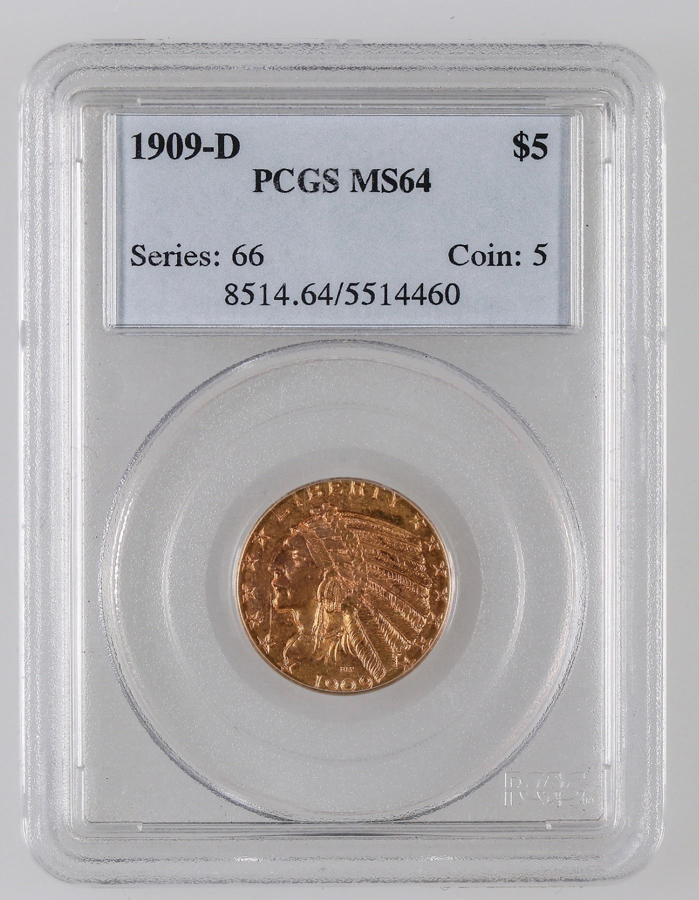 PCGS certified MS 64 1909-D Indian Head $5 gold piece. Mintage: 3,423,560. [ 5