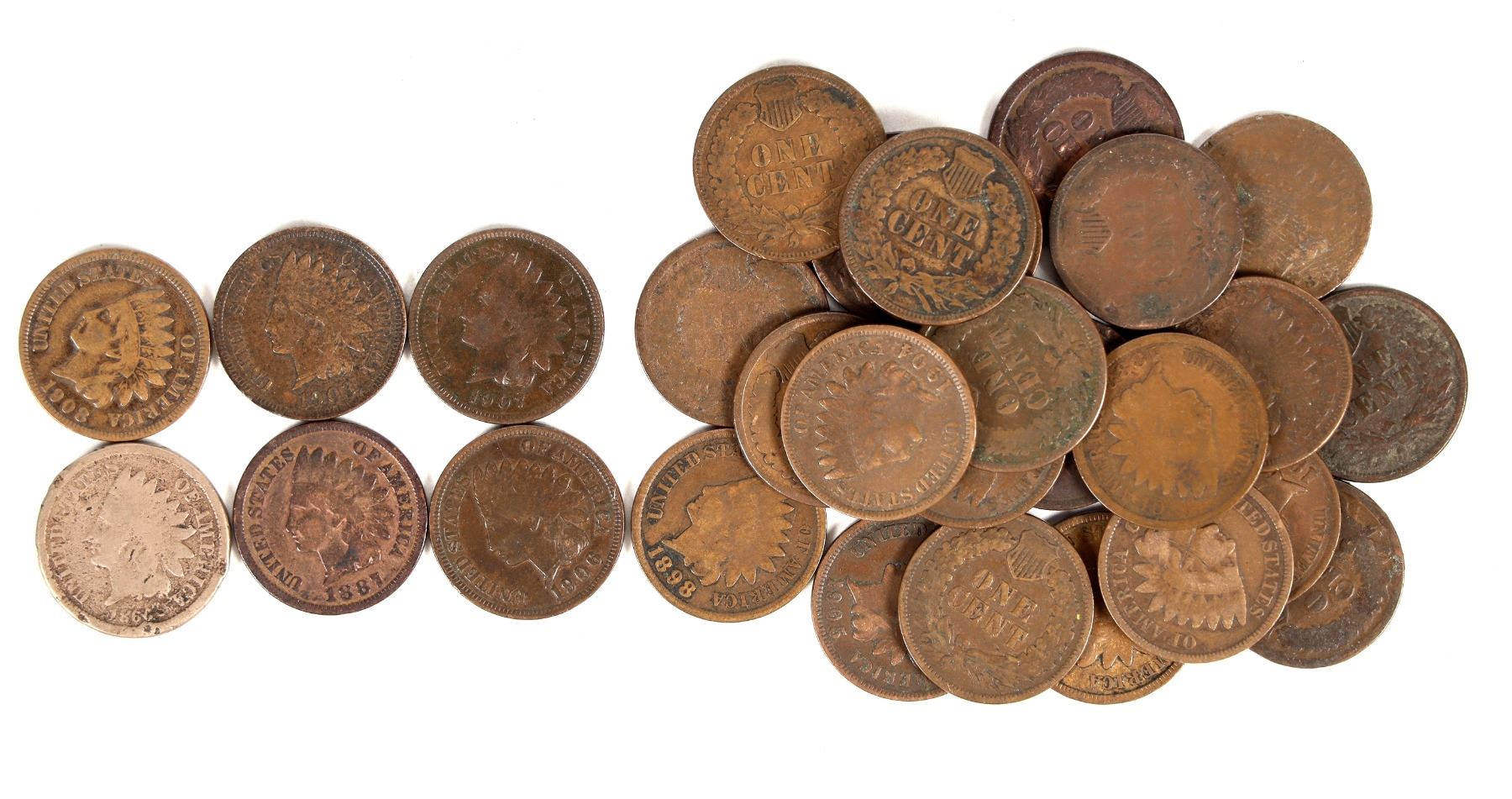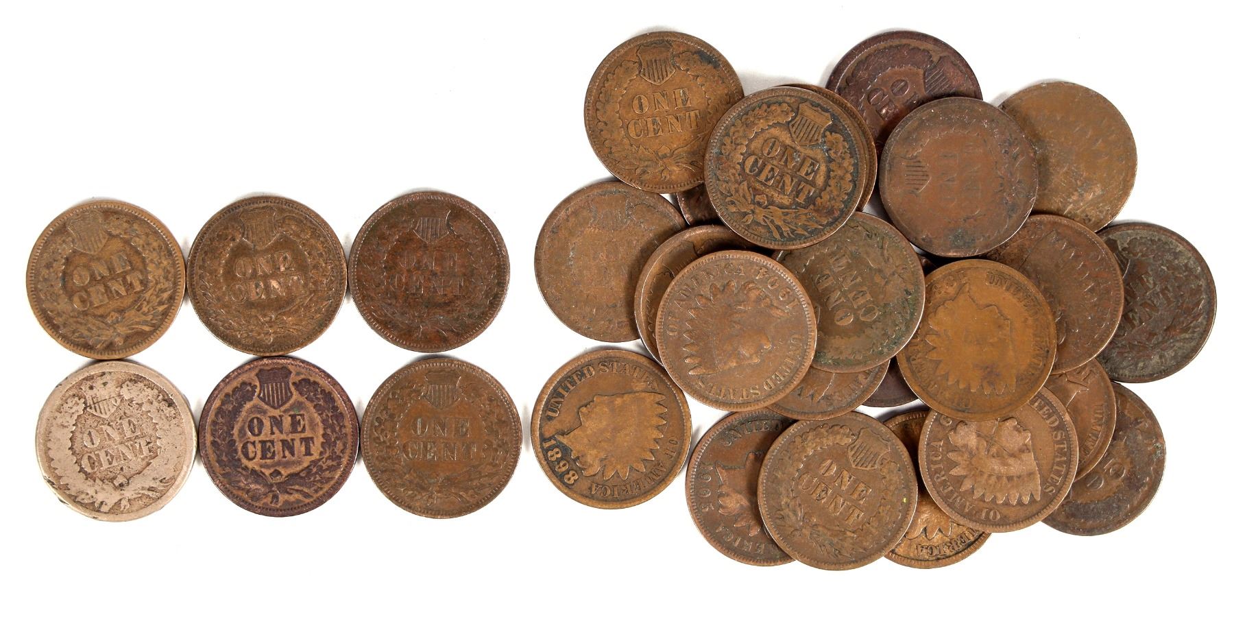 Indian head cents in AG-VF condition. 31 different dates: 1860, 1865, 1871, 1880, 1881, 1882, 1883, 1884, 1886, 1887, 1888, 1889, 1890, 1891, 1892, 1893, 1895, 1896, 1897, 1898, 1899, 1900, 1901, 1902, 1903, 1904, 1905, 1906, 1907, 1908, 1909. Start your coin album here, finish the series at your next coin show!