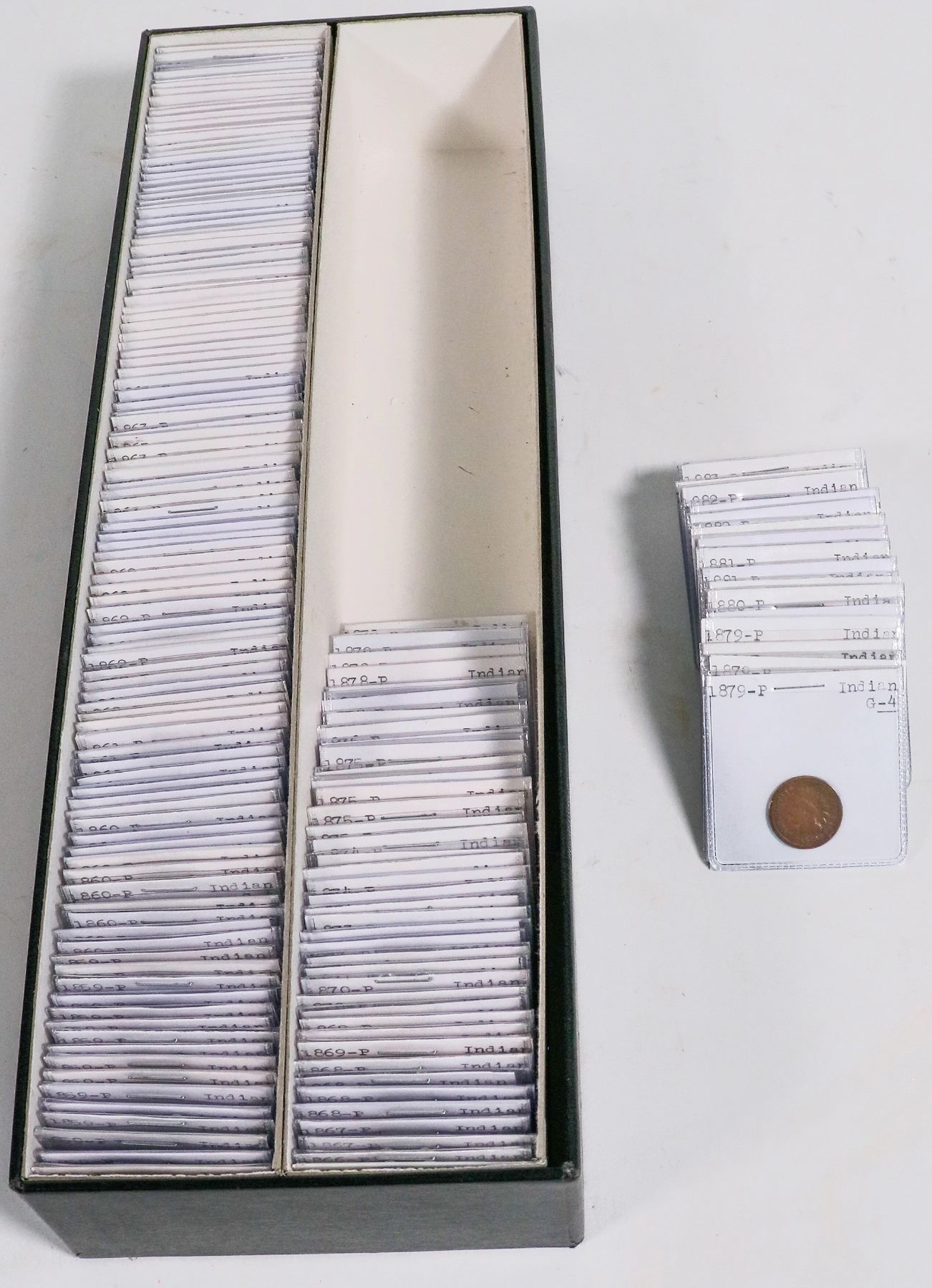 Large box of Indian head cents in 2 x 2 plastic, dated and graded. 1859 (16) AG-EF; 1860 (13) round bust: G-F; 1860 (2) pointed bust; 1861 (4) Good; 1862 (13) AG-G; 1863 (32) AG-VF; 1864 (22) Good; 1865 (9) AG-G; 1866 (2) AG-G; 1867 (2) Good; 1868 (4) Good; 1869 (4) AG-G; 1870 (2) AG-G; 1871 Good; 1872 Good; 1873 (4) AG-G; 1874 (5) AG-G; 1875 (7) Good; 1876 (2) AG-G; 1878 (3) Good; 1879 (8) Good; 1880 (3) G-VF; 1881 (4) G-VF; 1882 (4) G-F; 1883 (2) VG-F; 1906 EF. Over 165 coins.