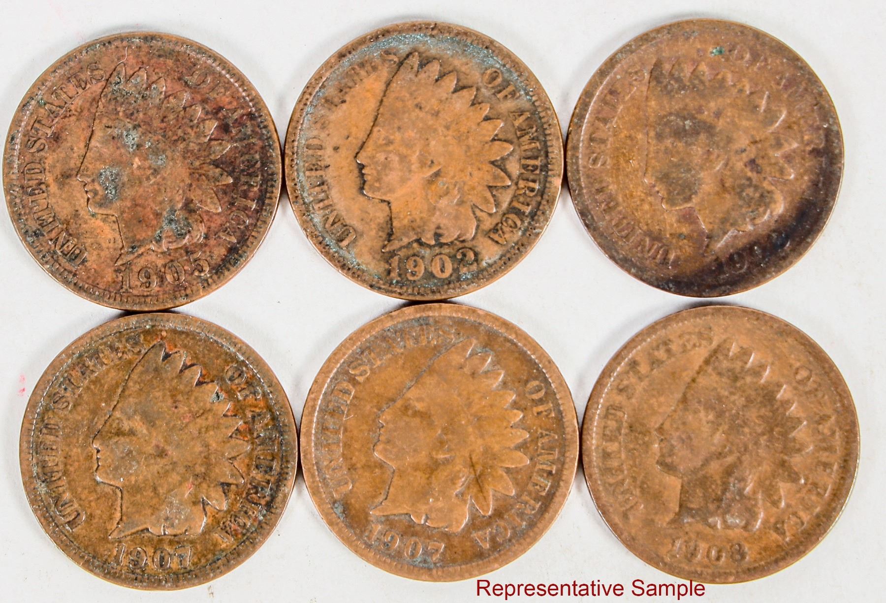 Eleven Indian head cents each year 1900-1908, plus one for an even 100 coins. G-F condition.