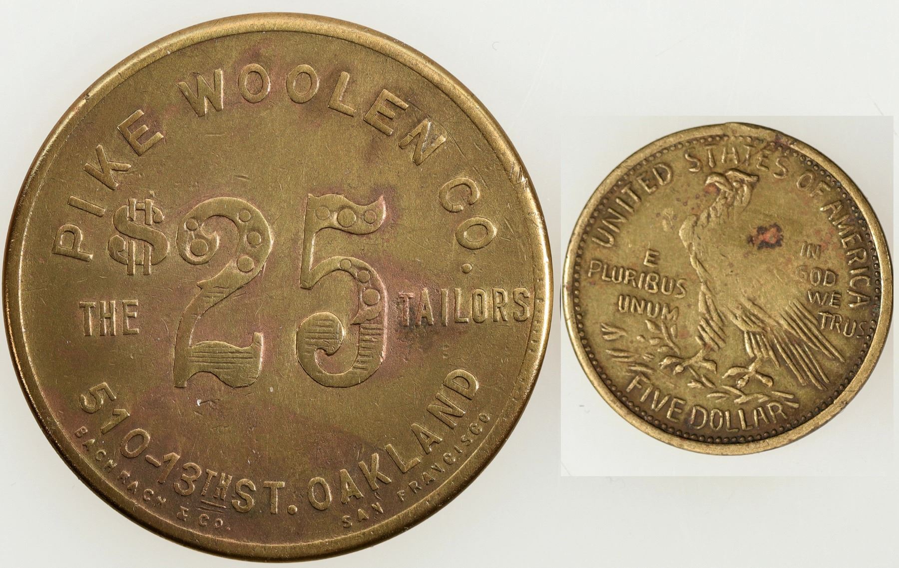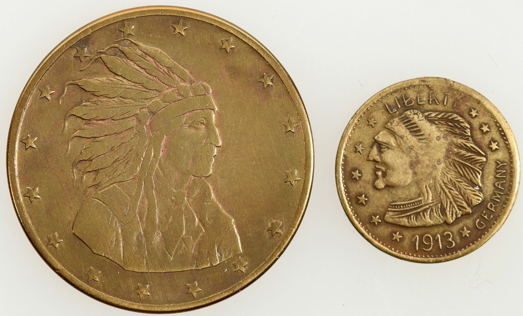 Lot of two examples of Indian Head gaming counters. 1) Pike Woolen Co. / The $25 Tailors / 510-13th St. Oakland // Indian Head / 16 stars; br., rd., 32 mm. Tokencatalog.com notes: W. H. Pike, 1906-1909 ads in Oakland Tribune - 510 13th St.; 1912+ ads show them at 1315 Franklin. 2) Liberty / Indian Head / 1913 Germany // United State of America / E / Pluribus / Unum / pictorial eagle / In God We Trust / Five Dollars; Br., rd., 20 mm. This piece is intended to look like a U.S. five dollar gold piece, as outlined in Fred Holabird's August 2020 essay on gaming counters featuring the Fauver Collection.