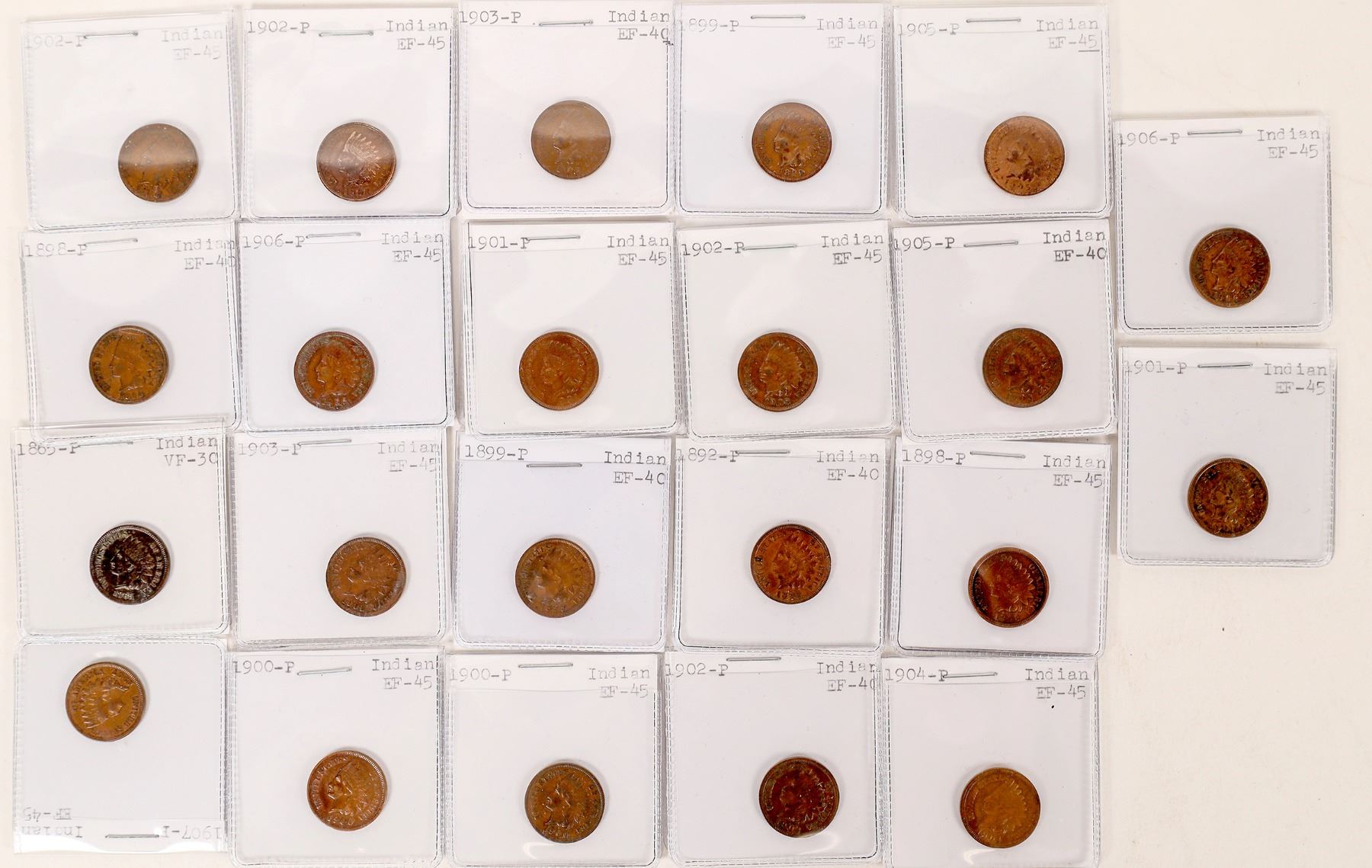 Lot of 22 Indian head pennies all in EF condition (one is VF): 1865; 1892; 1898 (2); 1899 (2); 1900 (2); 1901 (2); 1902 (4); 1903 (3); 1904; 1905 (2); 1906 (2); 1907.
