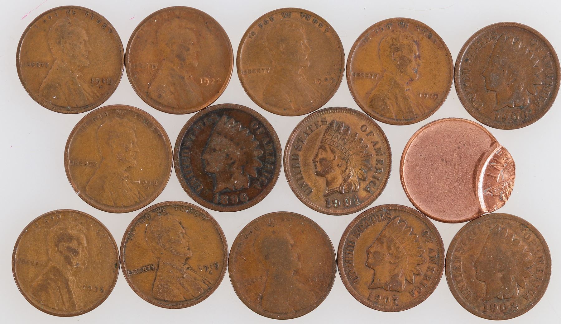 Five Indian head cents: 1896, 1901, 1902, 1906, 1907. Nine Lincoln cents: error planchet 90% off; 1909 VDB (G-VG); 1909 (G-VG); 1910-S (G-VG); 1918-S (G-VG); 1919-S (VG); 1922 weak D (G-VG); 1919 (G); 1936 (VG-F).