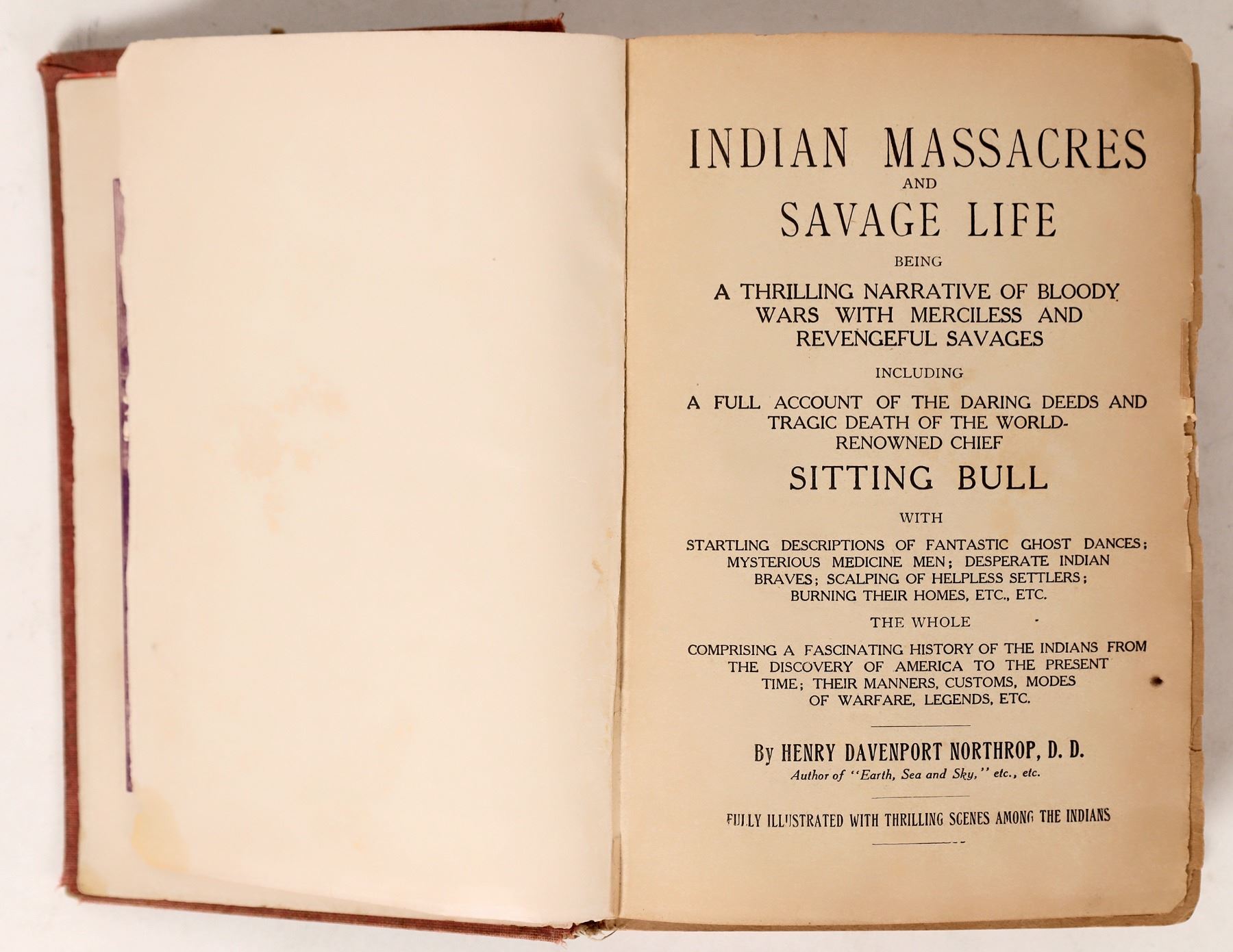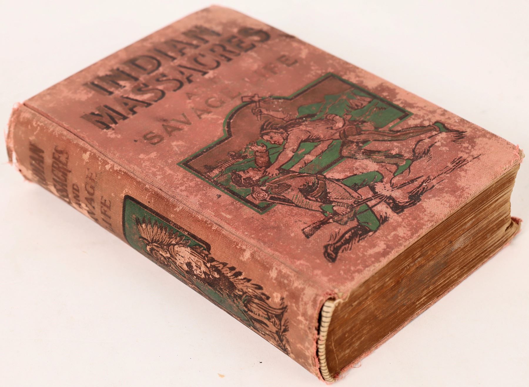 An 1891 edition of Indian Massacres and Savage Life, profiling Chief Sitting Bull amongst others. Boards are separating from spine. Please see photos for more detail. 1891