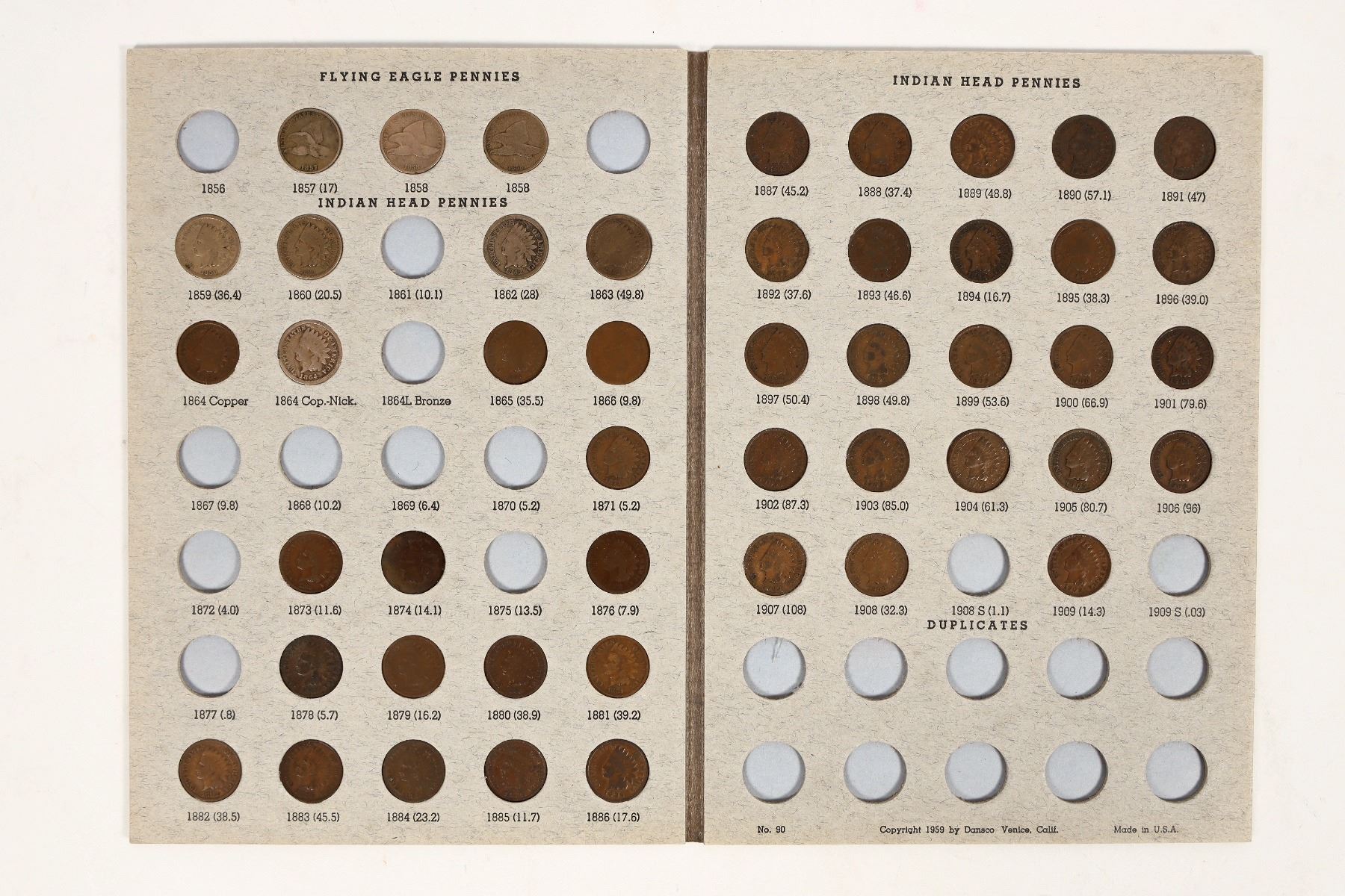 Brown Dansco coin album #90 (copyright 1959) Indian Penny. With 47 coins, including three flying eagle cents. Coins range from fair to very fine condition.
