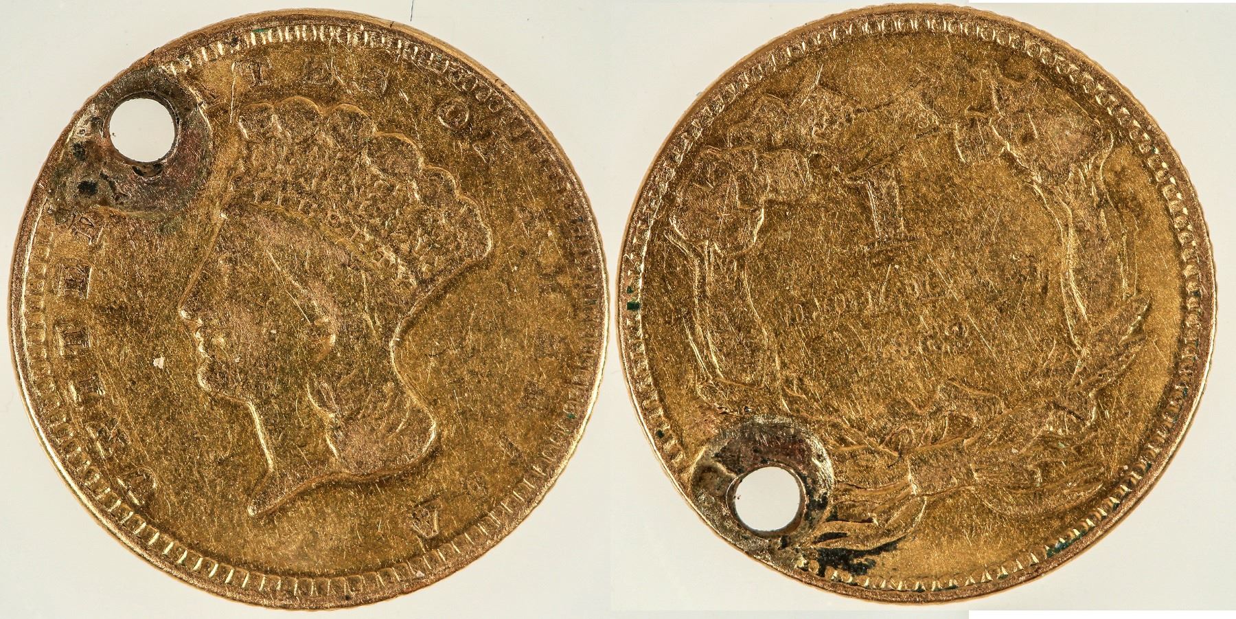 Indian Princess Head $1 U. S. gold piece, holed at 11 o'clock. VG-F condition; 1.5 grams; 15 mm. Mintage: 1, 361,355.
