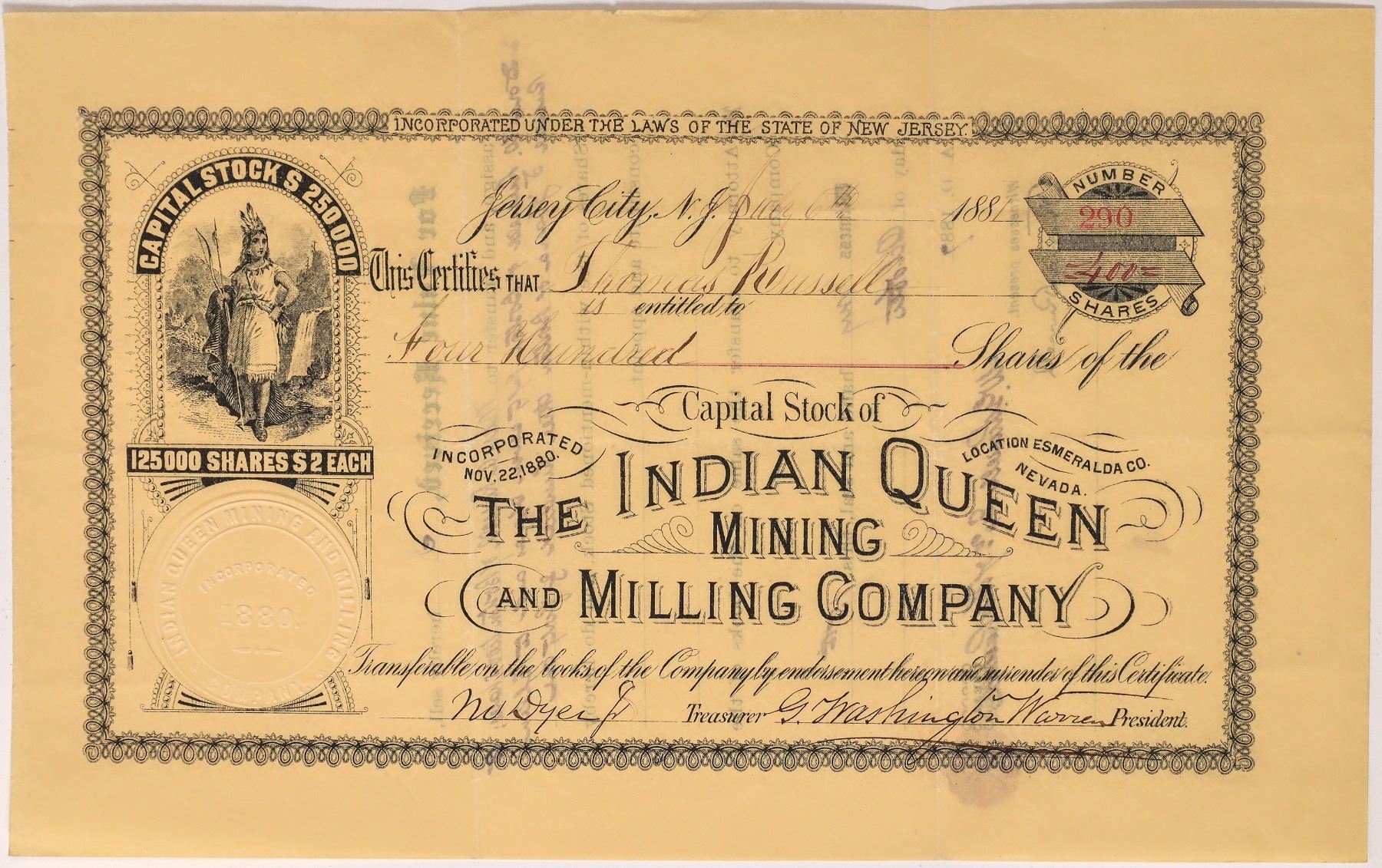 Choice. Located on Furnace Creek, Death Valley area. Location: Esmeralda Co., Nevada. Incorporated in New Jersey in 1880. # 290 for 400 shares to Thomas Russell on July 6, 1881 in Jersey City. Signed by president G. Washington Warren and treasurer N. O. Dyer Jr. Not cancelled. Black print on yellow paper. Indian Queen vignette. Folds, light wear. Reverse of certificate has the information on the death of Thomas Russell. Includes a very nice, crisp, clean small red seal! Discovered by Indian Charley in 1870 who was shot and killed by an officer of the law. Several newspapers place the location on Furnace Creek ñ Death Valley area. The Indian Queen was the principal mine in the district, opened to a depth of 400 ft. The ore is very refractory but also rich and processed by a 5-stamp mill and Howell roasting furnace. [Burchard, 1883, pg. 149] Research information on the mine and district included.