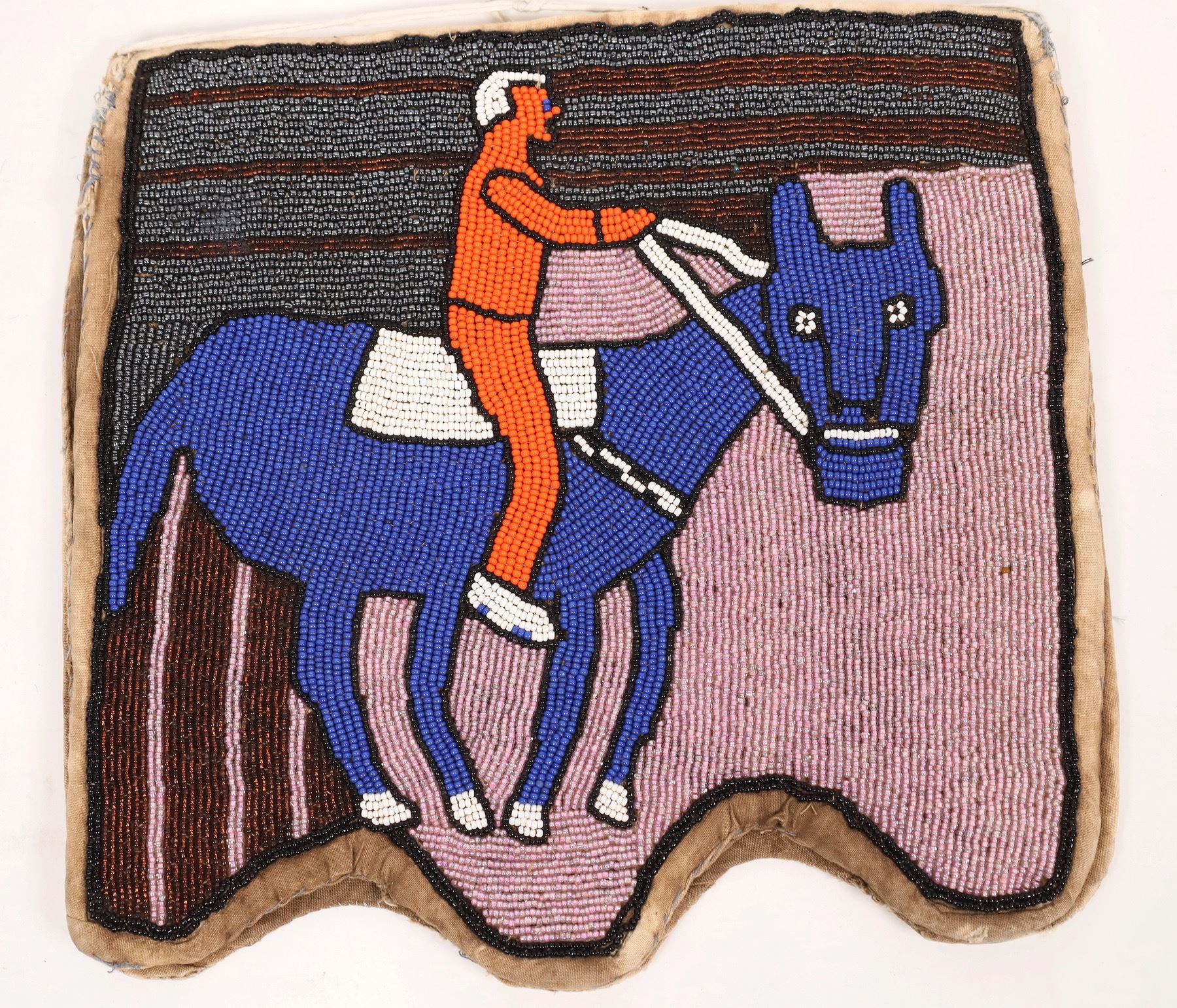 Beaded panel depicting an orange man riding a blue horse or mule. White beads are used for the man's hair and shoes and the horse's hooves and saddle. Purple, brown, and grey beads make up the background of this piece. There is a string attached to the top that can be used to hang this piece on a wall. Panel is 12 x 11.5, good condition. City: State: Date: