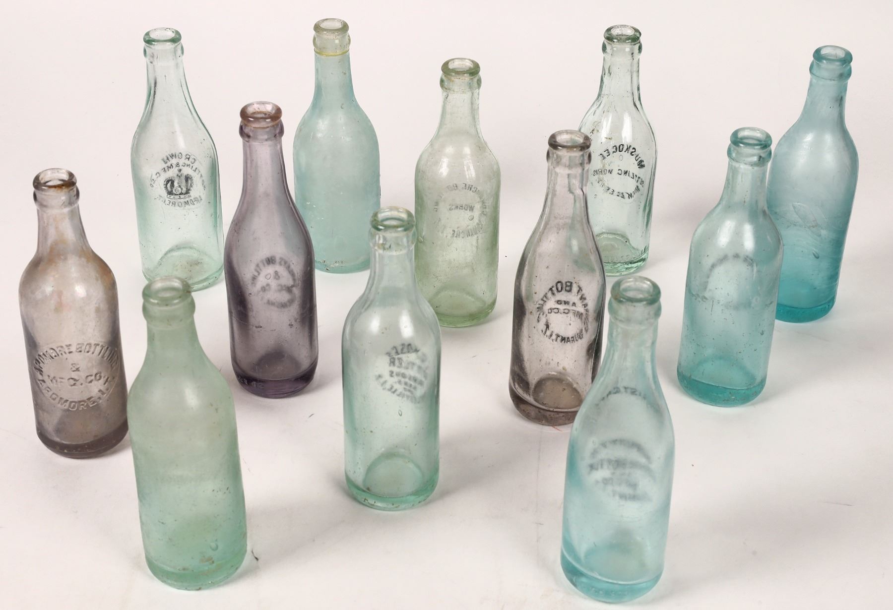 12 Indian Territory embossed crown top soda bottles. Green-Comanche Bottling/Comanche I T 7.75". Muskogee Bottling/Muskogee I T 7.5". Clear-Durant Bottling/Durant I T 8". Farleys Bottling/Chickasha, IT-glued top. Ardmore Bottling/Ardmore I T 7.75"-lip ding. Aqua-L C Moses Bartlesville IT 7.75". L C Moses/Parsons, Kans. and Bartlesville IT 7.75". Atoka Ice & Power Co, Atoka, I T 7.75". Creek Bottling/Okmulgee I T 8". Crown Bottling & Mfg/Ardmore I T 8" with small lip chip. Crown Bottling/Durant IT8.25". H T Hatton/Chickasha IT 7.5" with glued top. Some case wear and stains. Please inspect.