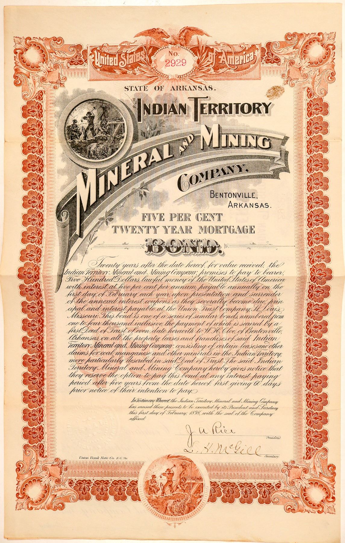 Location: Bentonville, Arkansas (printed on the bond). $500, 5%, Twenty Year Mortgage Bond. No. 2929, issued in 1898. All 20 coupons attached. Signed by J.A. Rice, president, and L.H. McGill, secretary. Attractive design with large logo and mining vignette. Same mining vignette is incorporated into the border. Very nice condition. According to the United States Investor (1903), the company was not able to develop its property due to adverse rulings from the Interior Department. Ken Prag Collection