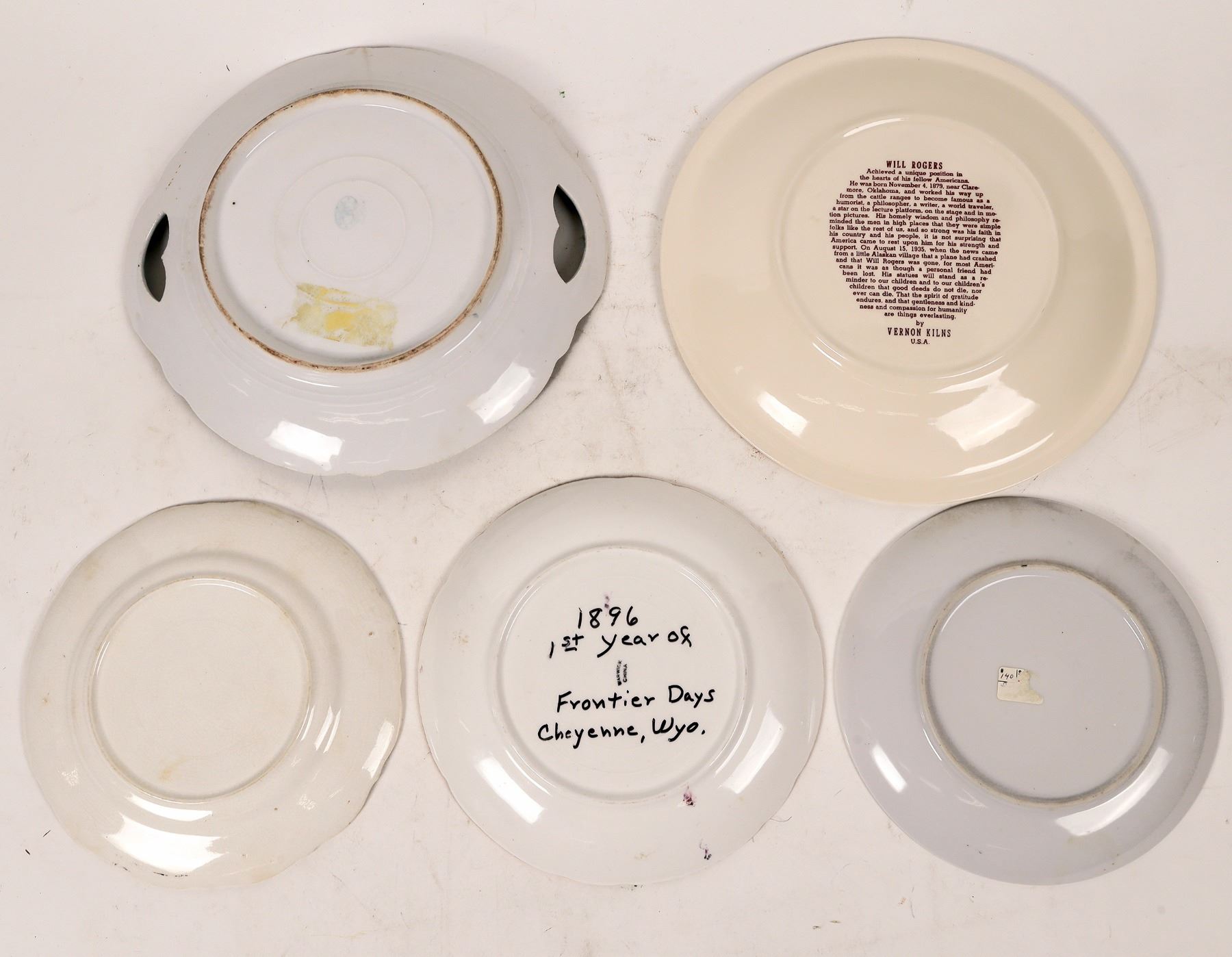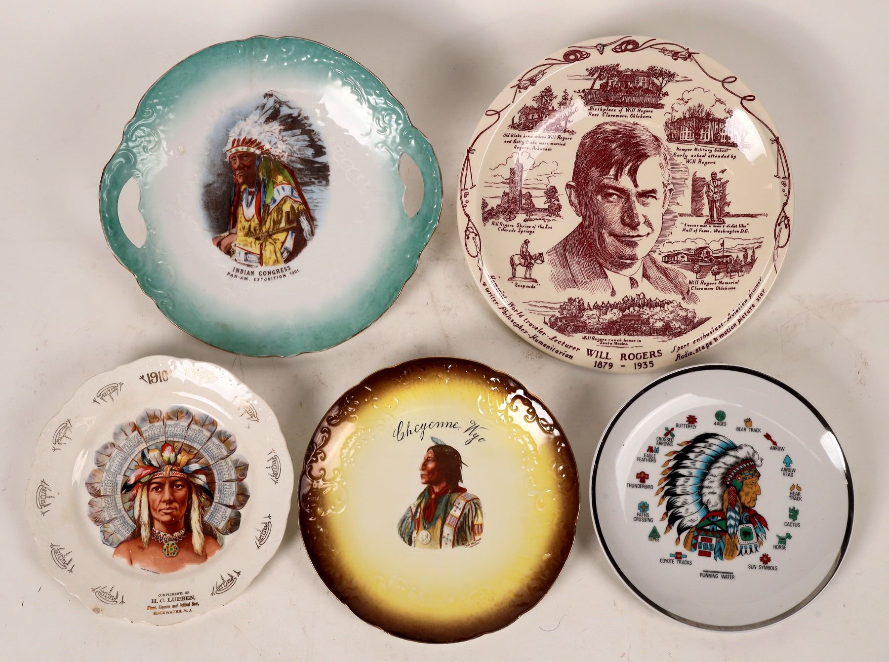 5 circular commemorative plates. 1896 Frontier Days, Cheyenne, Wyo with light .25" left side chip. 10.25" Indian Congress, Pan-Am Exposition 1901. 7.75" 1910 H C Lubben/Edgewater, NJ. 7.5" Running Water. 10.5" Will Rogers. No other apparent chips or cracks.