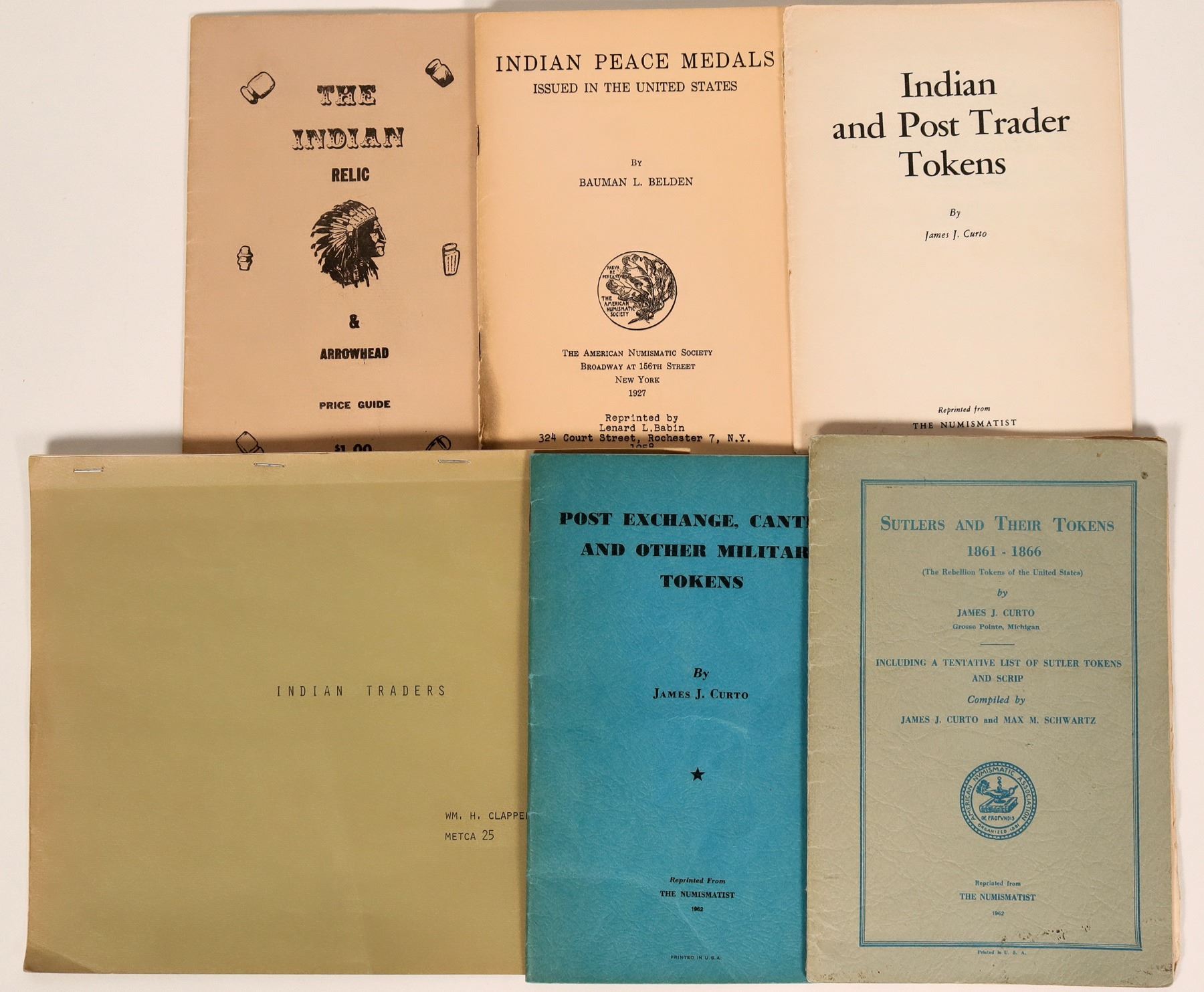 Lot of 6. 1) The Indian Relic and Arrowhead Price Guide. 2) Indian and Post Trader Tokens by James J. Curto. 3) Sulters and Their Tokens 1861-1866 by James J. Curto. 4) Post Exchange, Canteen and Other Military Tokens by James J. Curto. 5) Indian Peace Medals Issued in the United States by Bauman L. Belden. 6) Indian Traders WM. H. Clapper METCA 25. RARE.