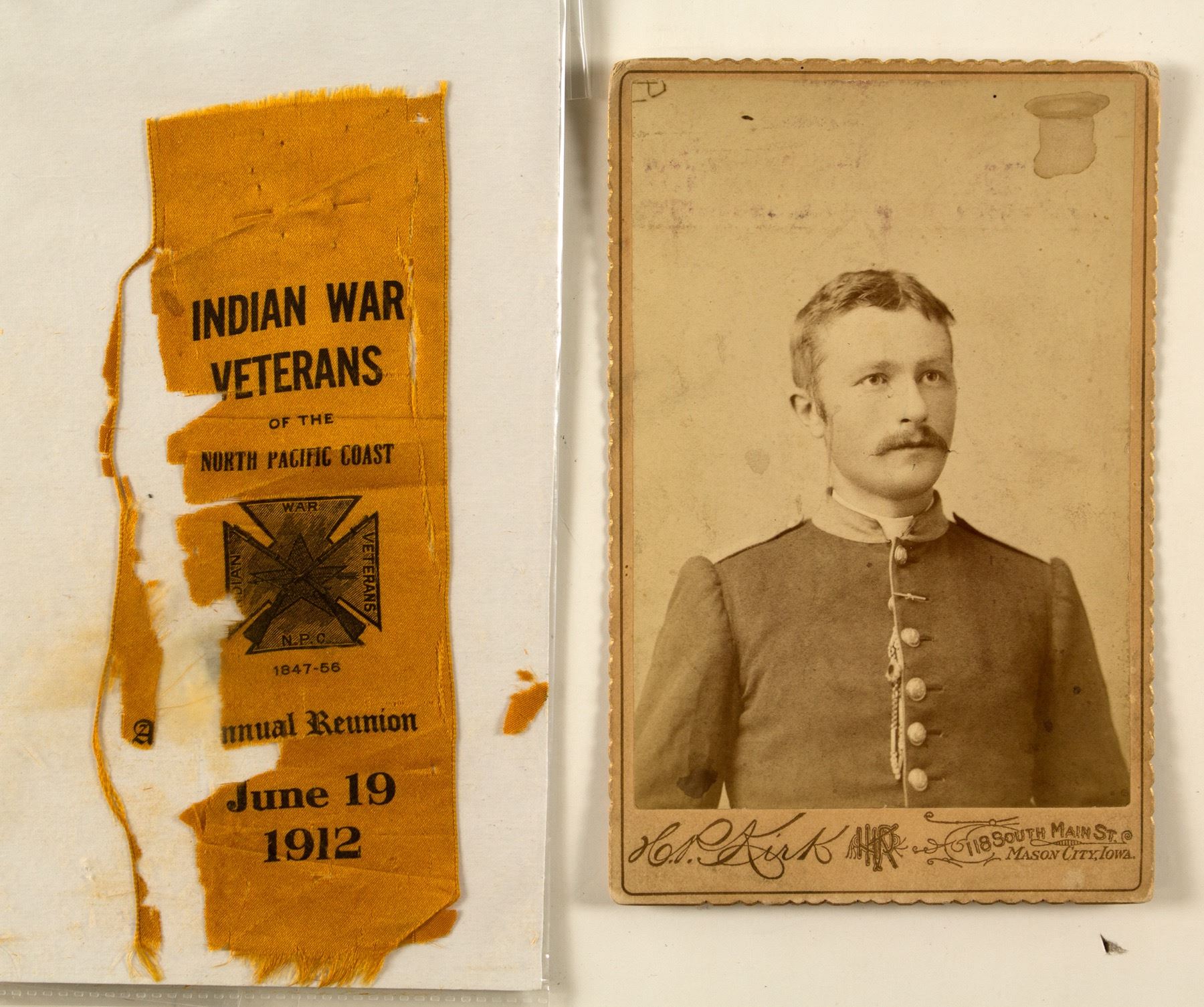 1870's cabinet card photograph (6.5" x 4") of an Indian Wars officer, unidentified. Photograph by H. P. Kirk's Photographic, Mason City, Iowa. Included is a ribbon, 2.5" x 8", "Indian Wars Veteran of the North Pacific Coast", 1847-56. Annual reunion, June 19, 1912. Ribbon is very tattered and torn, but readable. Items were purchased together in Eugene, Oregon. State: Oregon City: HWAC#: 35341 Date: 1870's
