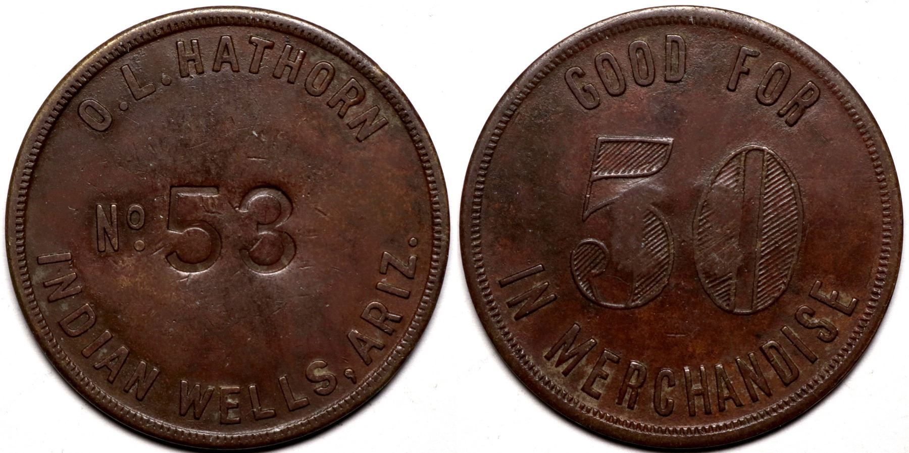O.L.Hathorn / No. 53 / Indian Wells, Ariz. // GF/50c/ In Merchandise. 40mm. R9