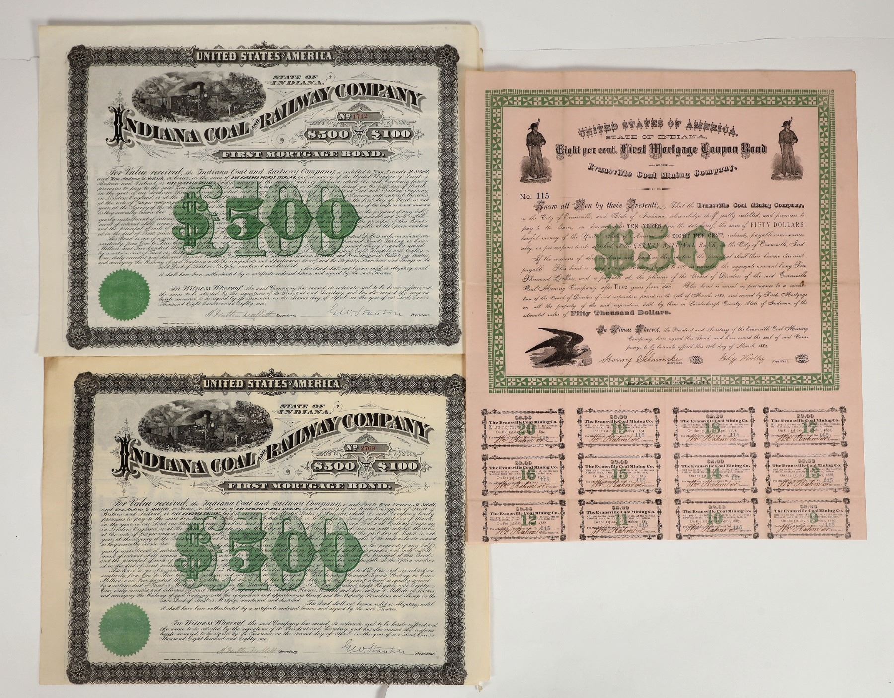 Lot of 3. 1. I/U. #1712 & 2769. Two Indiana Coal and Railway Co. $500 or $100, 6% bearer bond. Issued 1881, due 1891. Vignette top left train passing town. "$500/$100" green underprint. Coupons attached. Henry Seibert & Bros. printer. Both EF cond. 2. I/U, #115. Evansville Coal Mining Co. $50 8% bearer bond. Issued 1882, due 1892. Vignette miner with pick upper left/right corners. "%50" green underprint. Coupons attached. Ef cond.