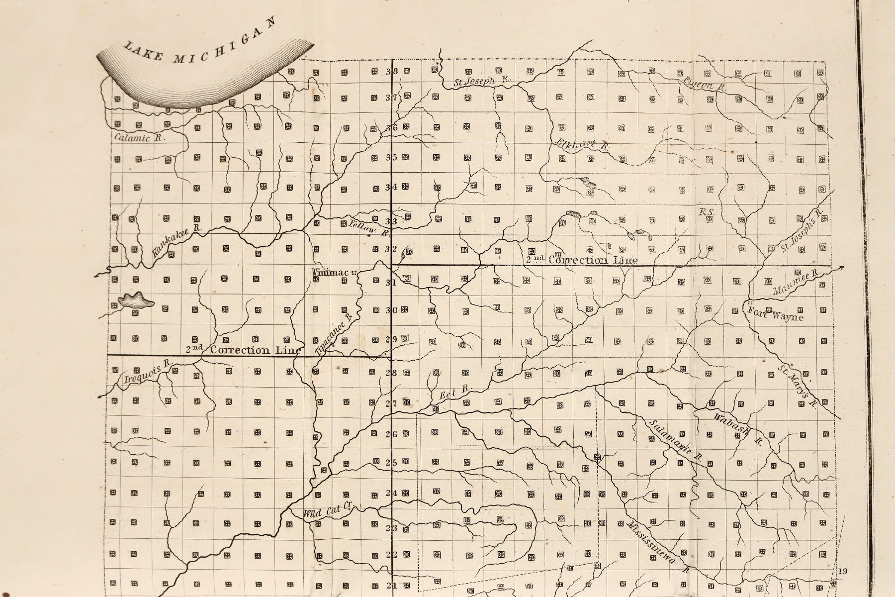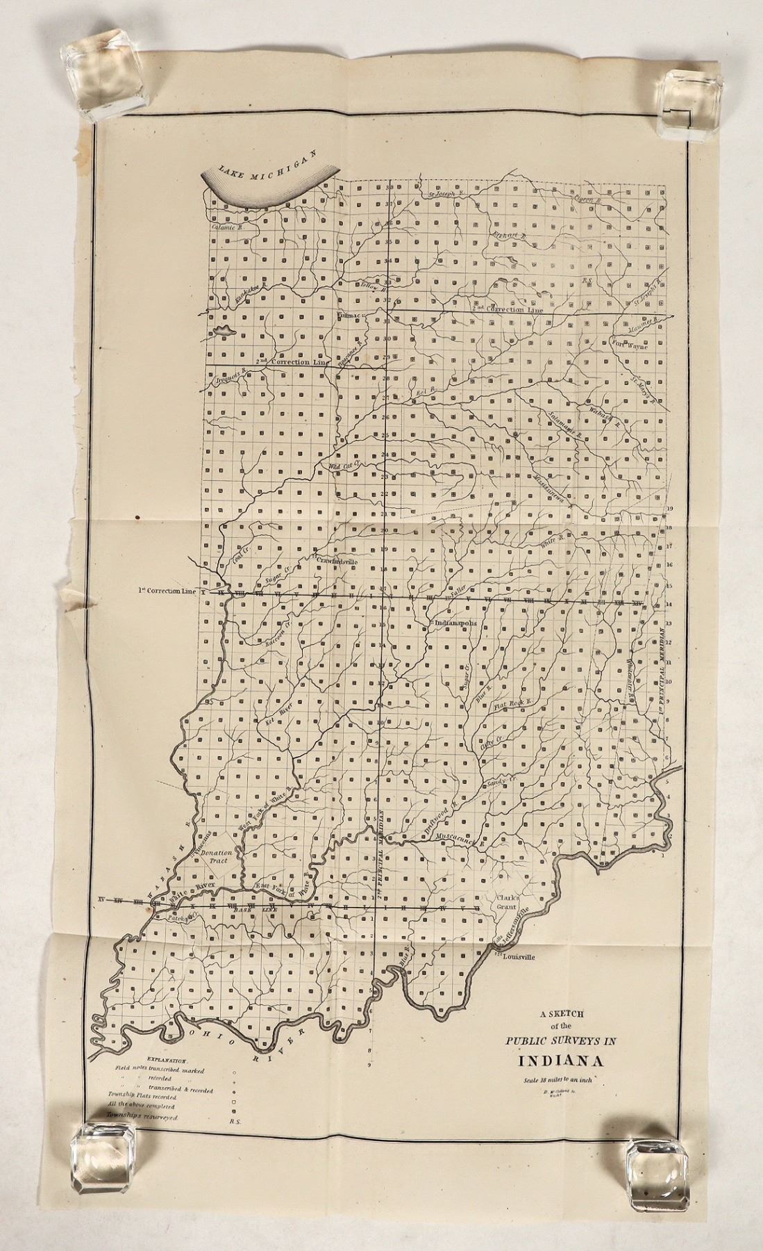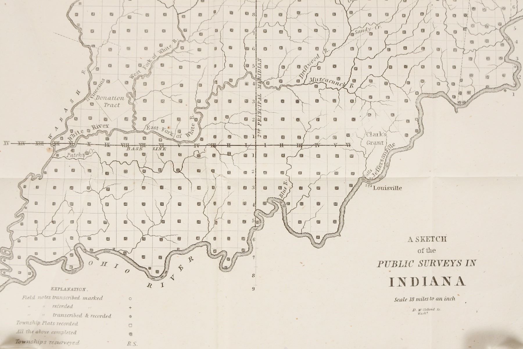 General Land Office Map, 1848, 11 x 20". Shows only three towns, Crawfordsville, Indianapolis and Louisville. 1" = 18 miles, typical of most of the GLO maps. This is a bit early in the scheme of land surveying in Indiana.