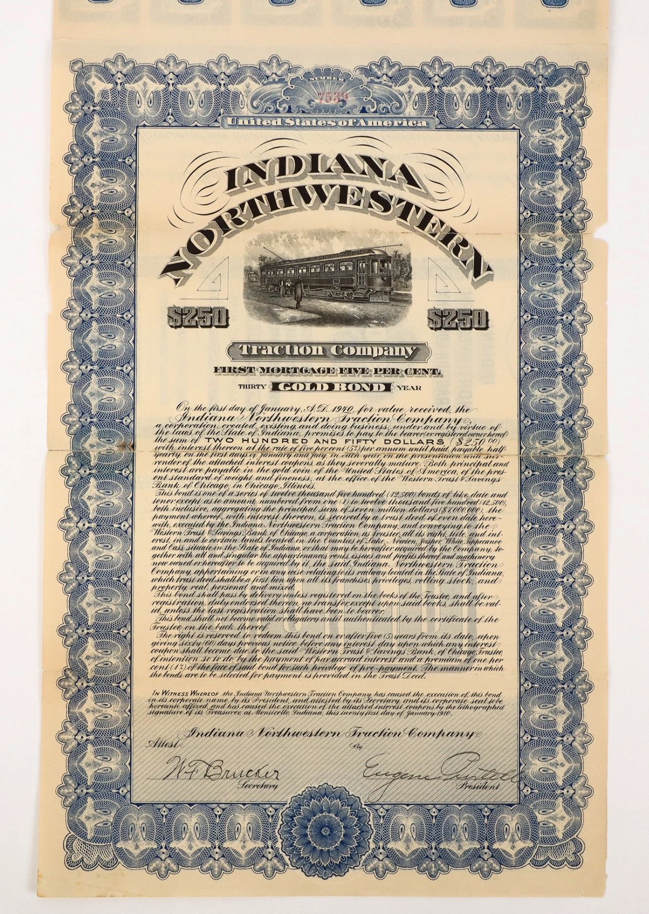 I/U. issued 1910. VG cond. Indiana Northwestern Traction Co., $250, 5% gold bearer bond with coupons.
