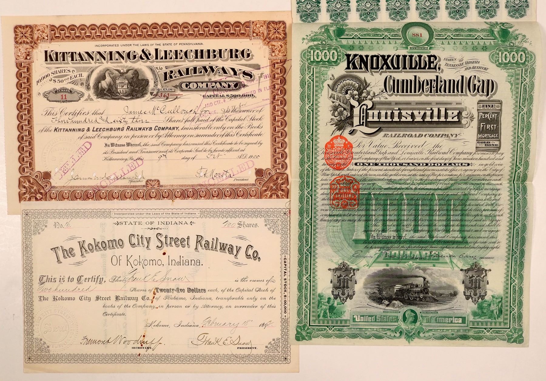 Three certificates. 1. Kittanning & Leechburg Railways Co. incorp 1904 Pennsylvania. #11, I/C, 3636 shares @ $50 par issued Feb 9, 1905 signed F.A. Moesta president. Rust, embossed seal, vignette top state seal. Western Bank Note Co. EF.