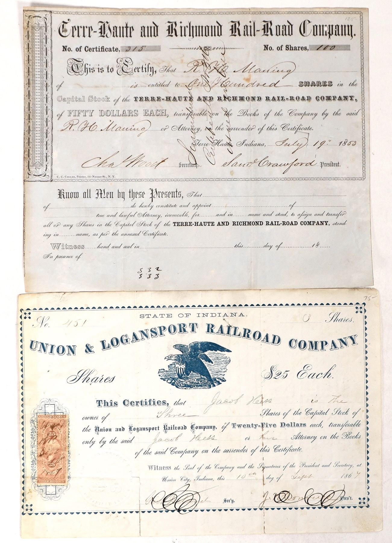 Issued stocks-1867 Union & Logansport RR-verso tape repairs, 1853 Terre-Haute and Richmond RR. Please inspect.