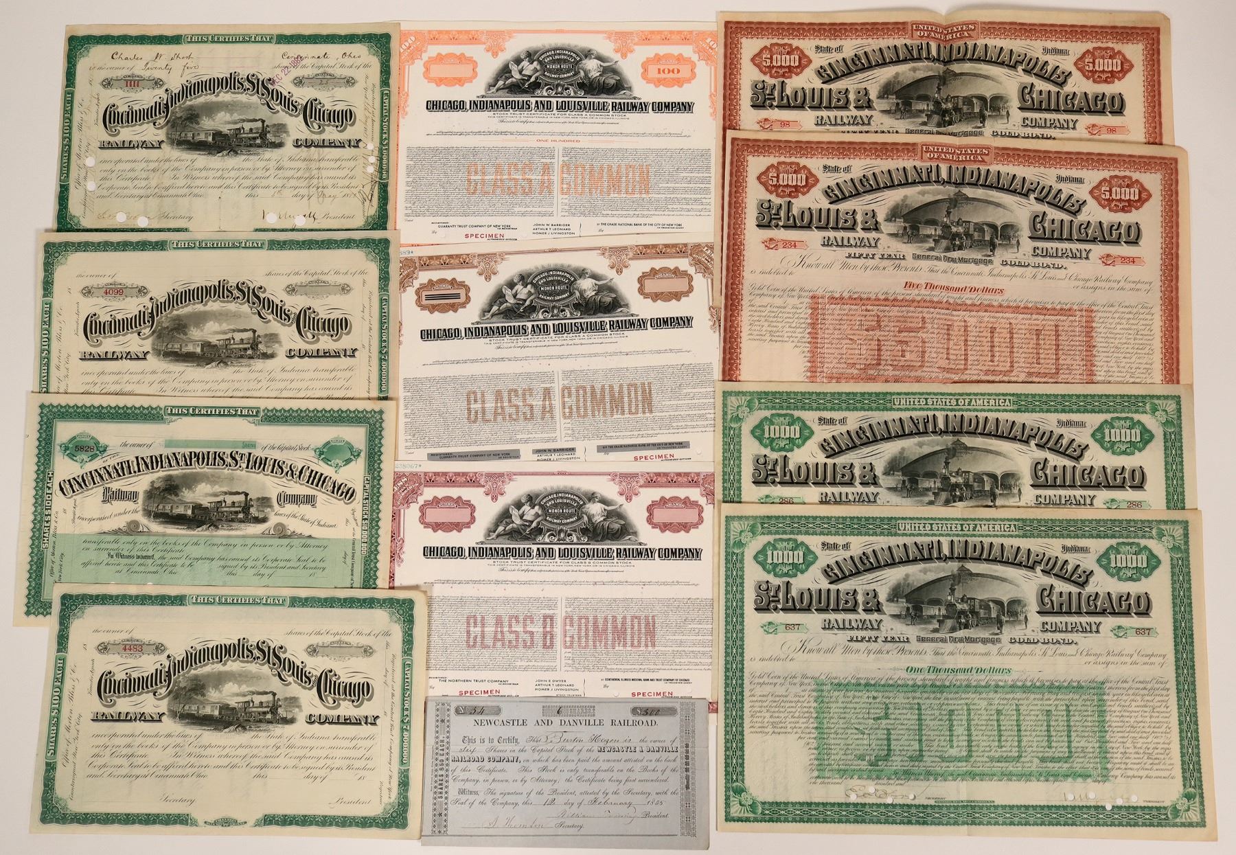 1) New Castle and Danville Railroad Co stock- Incorporated June 10, 1854 State of Indiana. I/U # 34 for 6 shares @ 450 par, issued Feb 12, 1855 signed by William Twiring president, black writing on blue paper, small train up right side , embossed seal w/loco in center. 2) Cincinnati, Indianapolis, St. Louis & Chicago Railway Co Bonds and Stocks (8). 3) Chicago Indianapolis & Louisville Railway Co SPECIMEN Stock Certificates (3)- Common Specimens, along with a crimson Class B Specimen. Vignettes of a seated male and female flanking the logo, "Monon Route". Hole punches at the bottom of certificates. Security Banknote Company. VF.