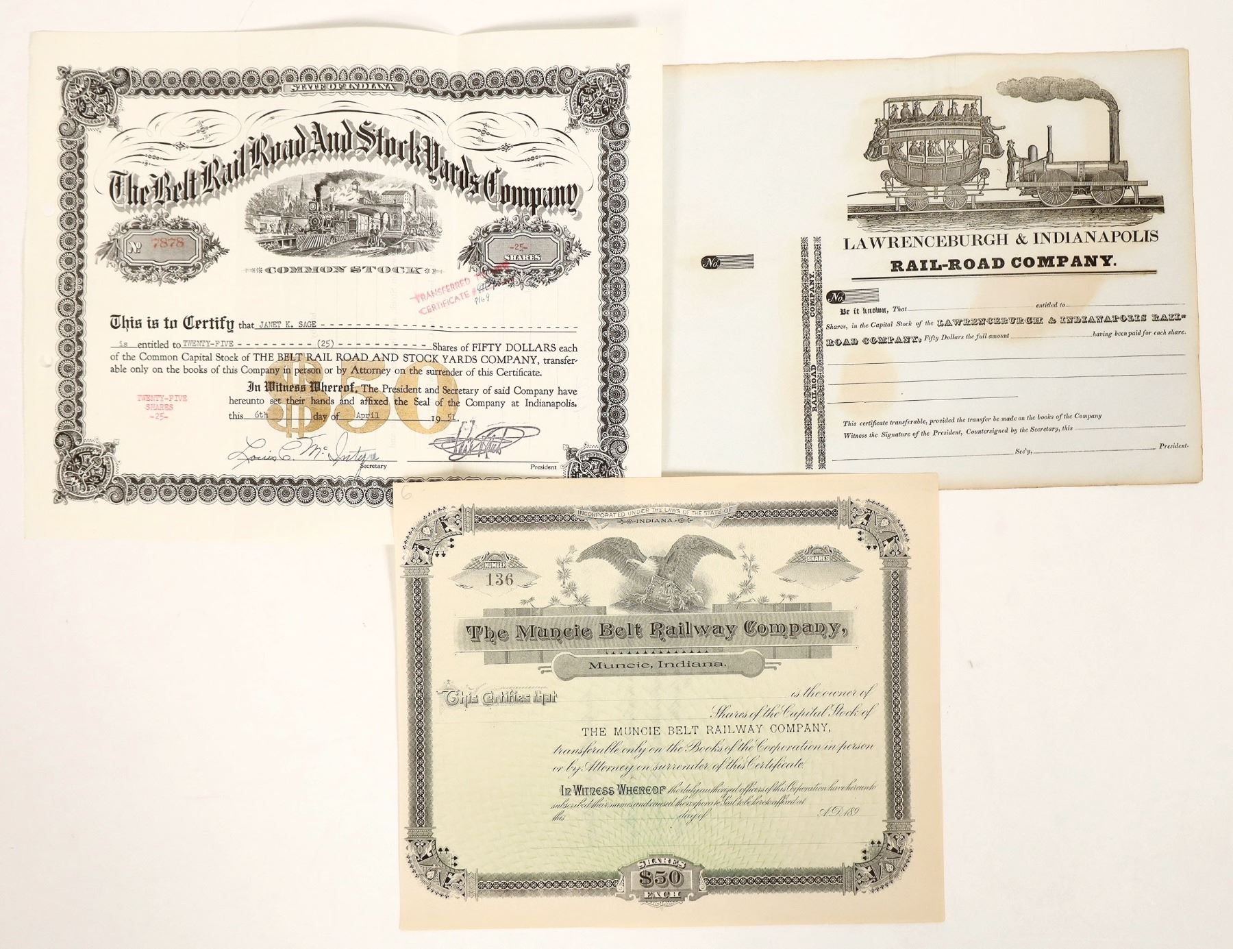 A group of three stock certificates from Indiana railroad companies, dating from the 1890s to the 1950s. The companies represented in the group are the Belt Railroad and Stockyards Company, Lawrenceburgh & Indianapolis Railroad Company, and the Muncie Belt Railway Company. The Muncie Belt and Lawrenceburgh certificates are unissued; the Belt Railroad certificate is signed by the company's secretary and president and stamped with the company seal. The certificates have interesting engraved vignettes.
