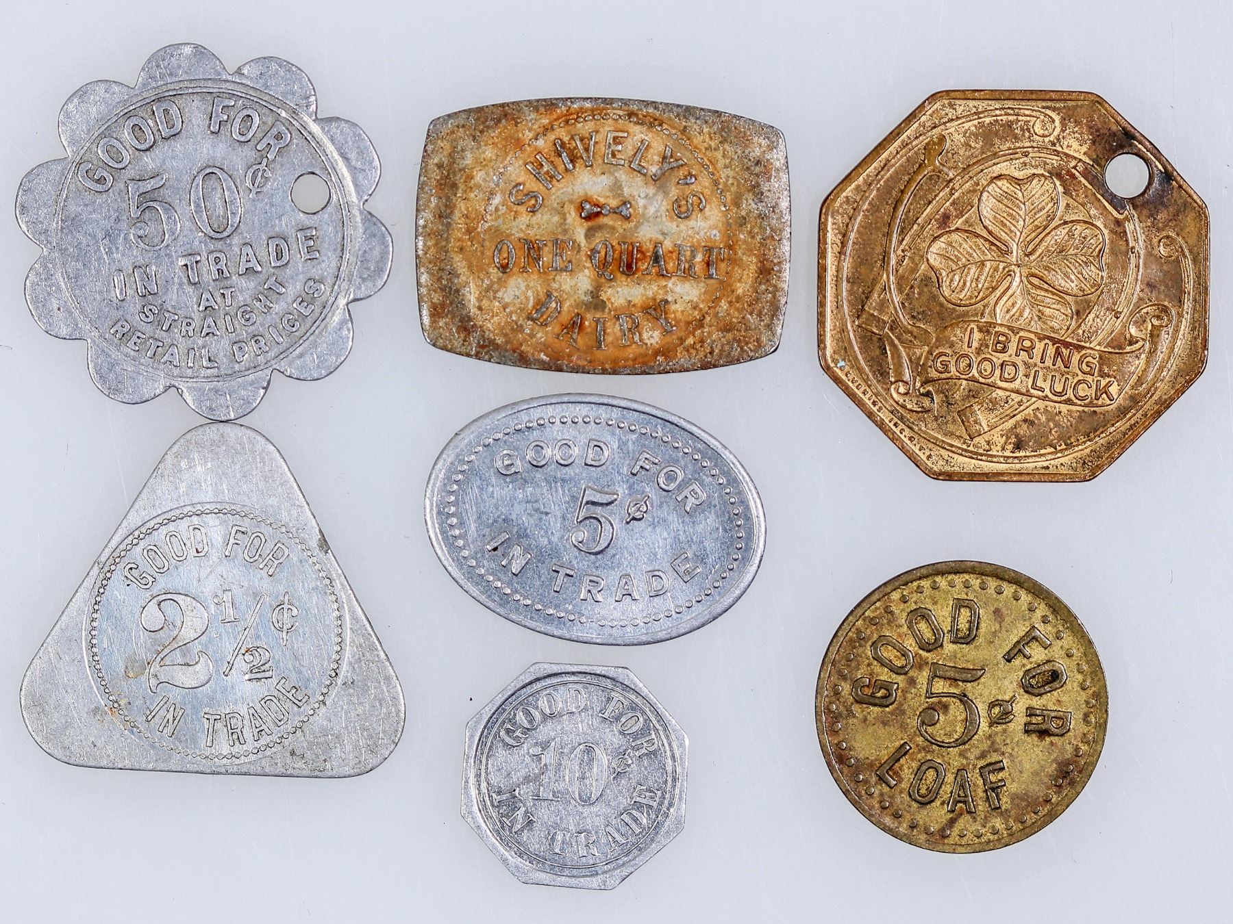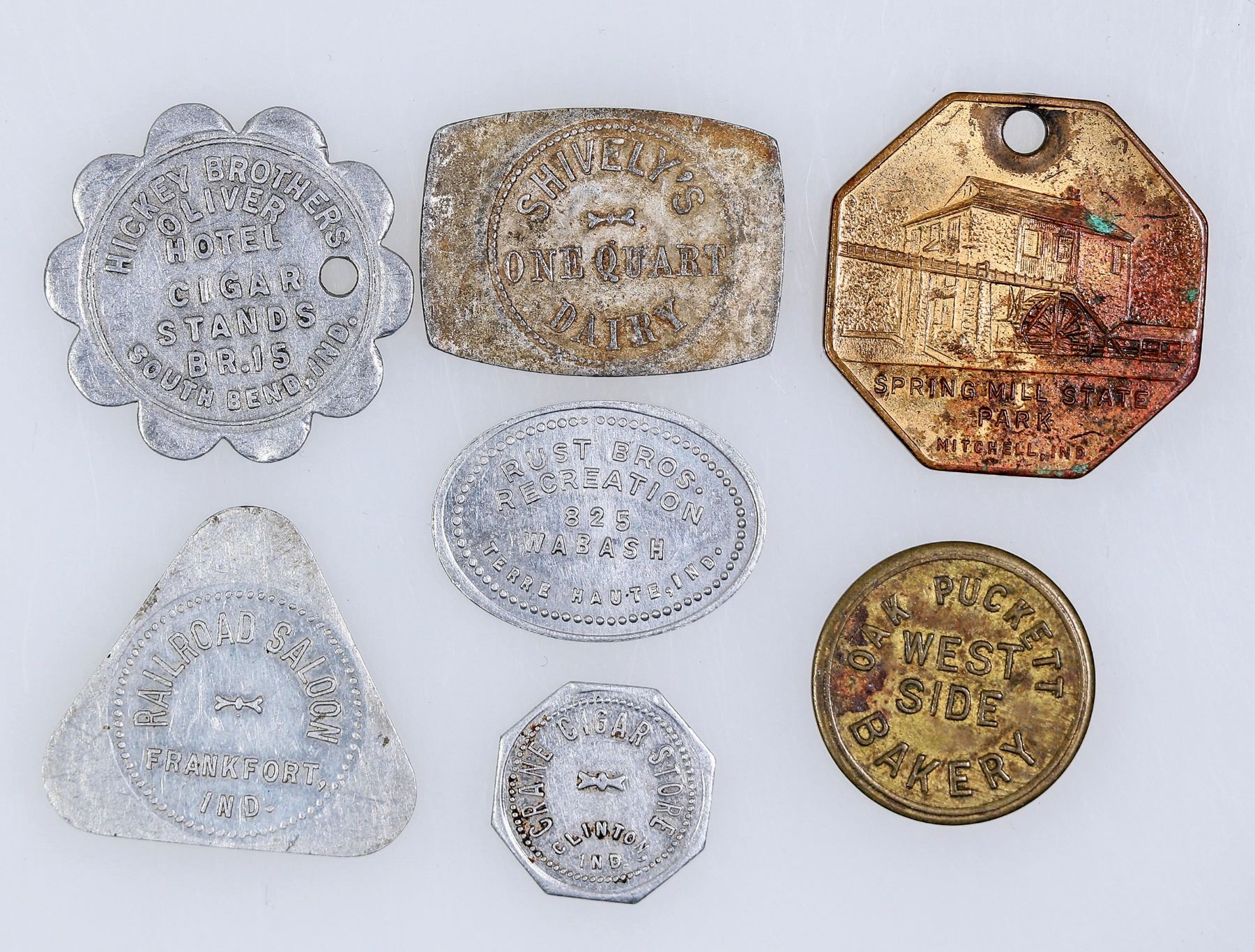 Seven Indiana tokens with different shapes: Railroad Saloon, Frankfort (triangle); Crane Cigar Store, Clinton (octagonal); Shively's Dairy, N. Manchester (rectangle); Rust Bros. Recreation, Terre Haute (oval); Oliver Hotel Cigar Stand, South Bend (scalloped); Westside Bakery, Winchester (round); Spring Mill State Park, Mitchell (octagonal, holed).