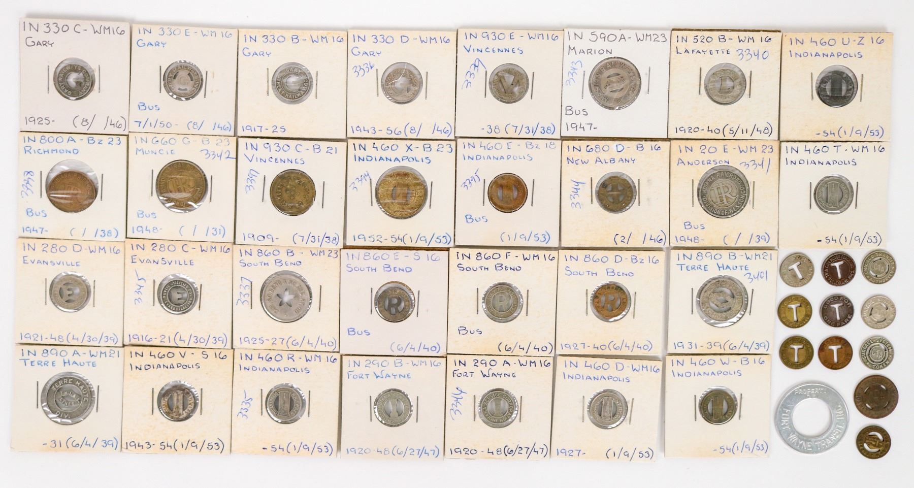 Group of 42 transportation tokens from various Indiana companies. See photo for details.