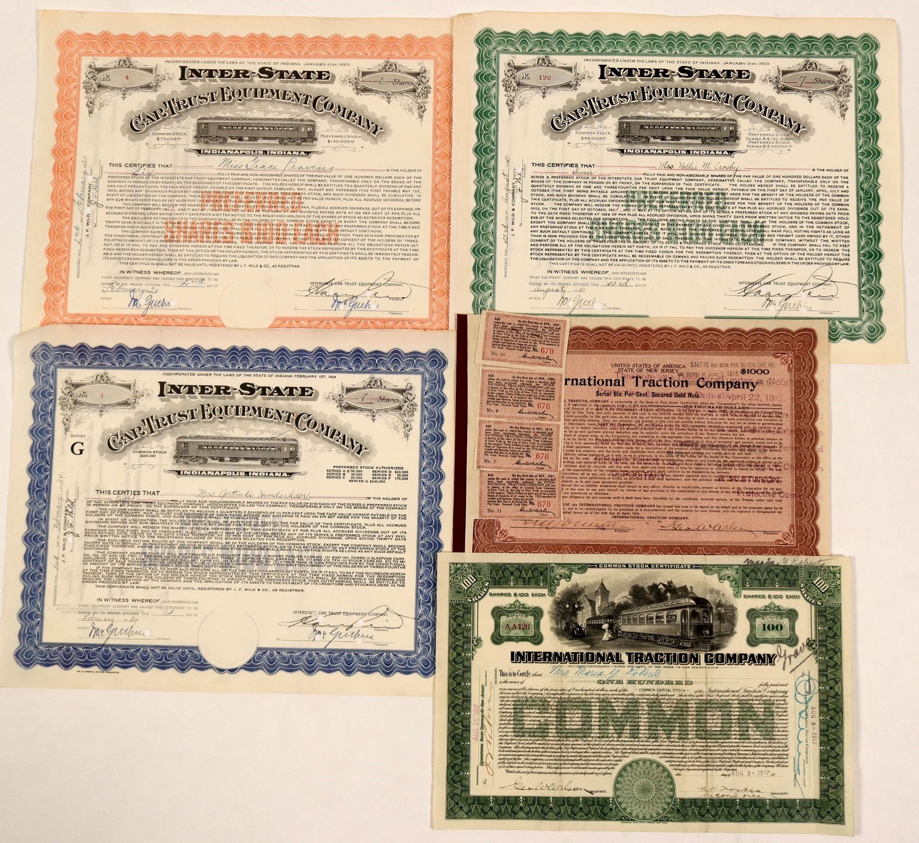 Five certificates. 1. Two stocks, International Traction Co. incorp. 1899 state of New Jersey. #AA1126, I/U, 100 shares @ $100 par, issued Aug.9 , 1917. Green, embossed seal, vignette top electric street car l-r. "COMMON" green underprint, American Bank Note Co printer. VF #670, I/C, Secured 6% gold note issued April 1, 1916. Brown, 7 coupons attached, American Bank Note C0. VF