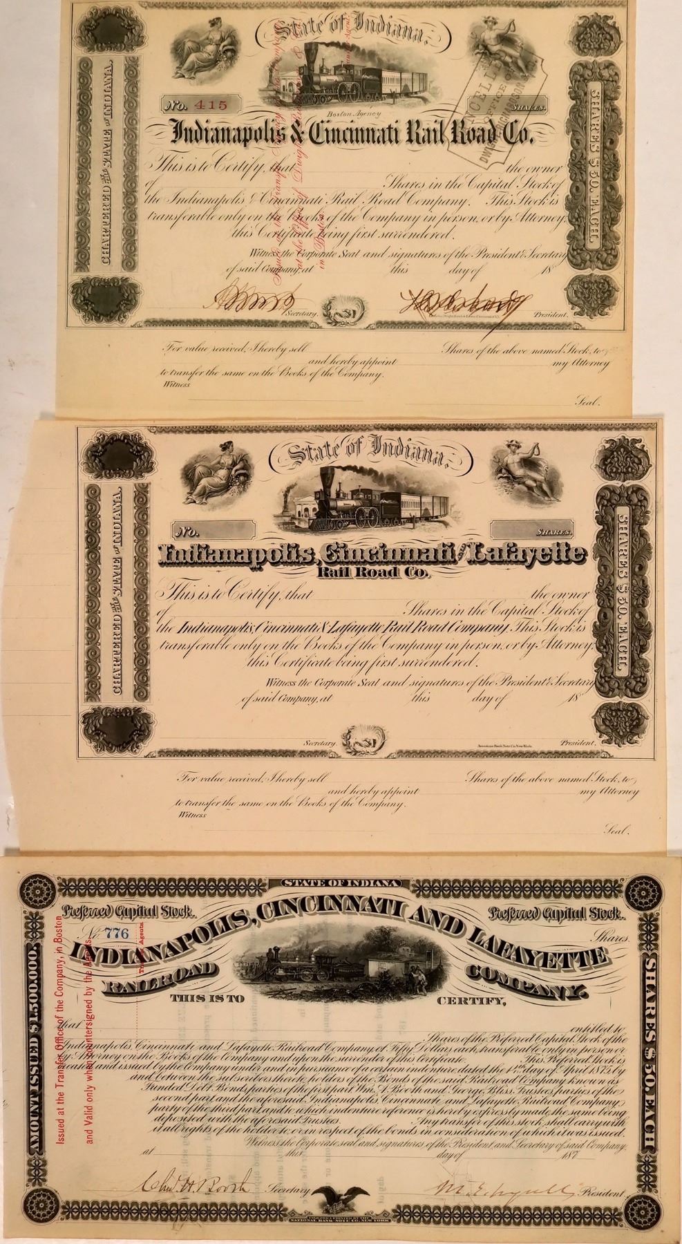 Three certificates. A railway line, originally between Indianapolis and Lafayette, was built by the Lafayette and Indianapolis Railroad in 1850. Over the years and due to mergers, the line was owned by a number of railroads during its operation including the Indianapolis, Cincinnati and Lafayette Railroad, 1867.