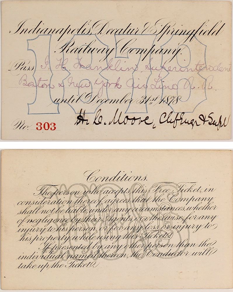 Pass No. 303, issued for 1878 to JH Franklin, superintendent of the Boston & New York Air Lines Railroad. Signed by H.C. Moore, chief engineer and superintendent. Light wear. Operated 1875-1887. (Potter Collection) HWAC# 59970 Date: Location: Indiana
