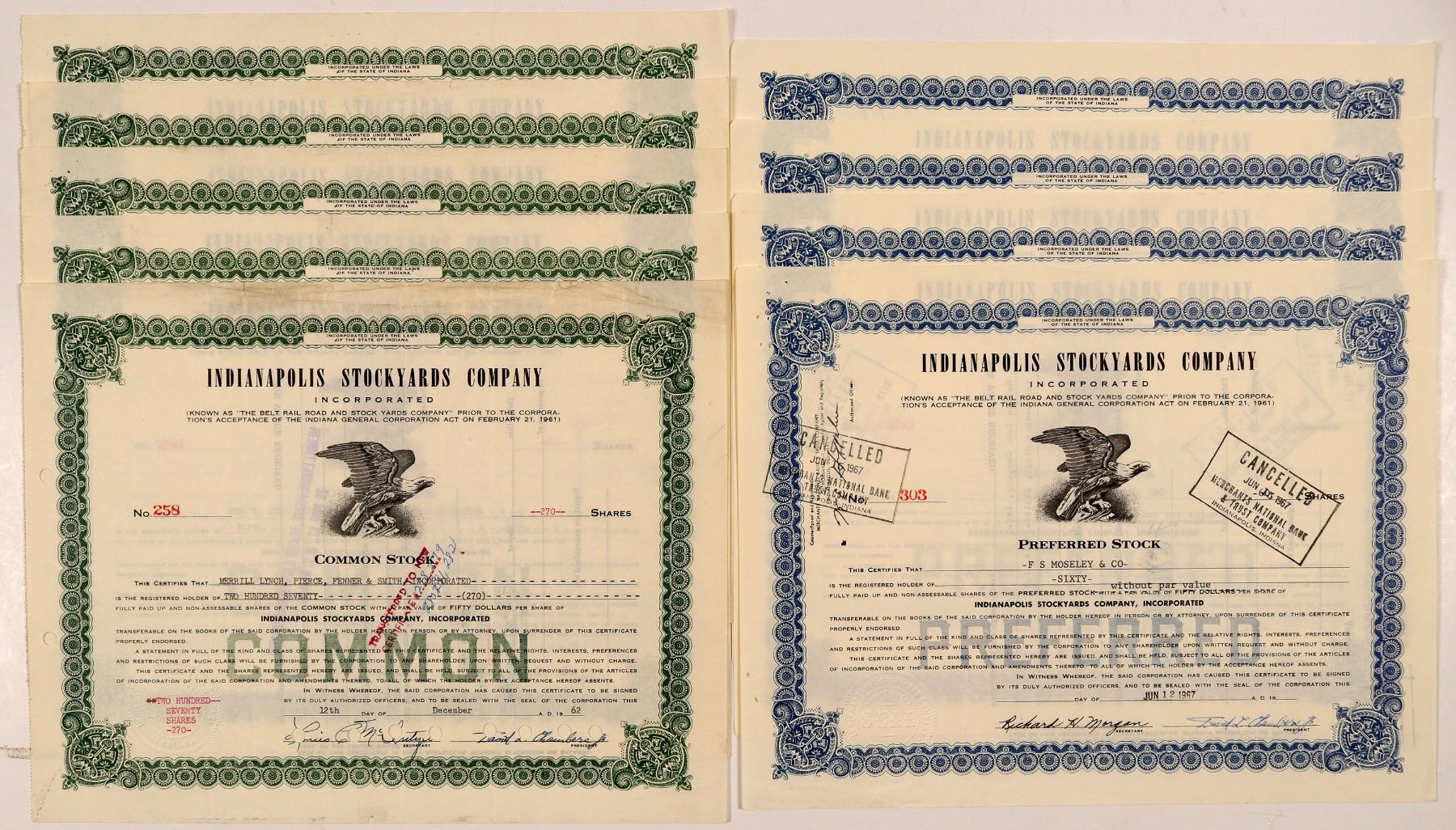 Lot of 9, two varieties. Issued 1962-1967, punch cancelled. Green or blue borders, eagle vignette. "Known as the Belt Rail Road and Stock Yards Company, Prior to the Corporation's Acceptance of the Indiana General Corporation Act on February 21, 1961." (printed on certificate). Cattle stockyards. Ken Prag Collection