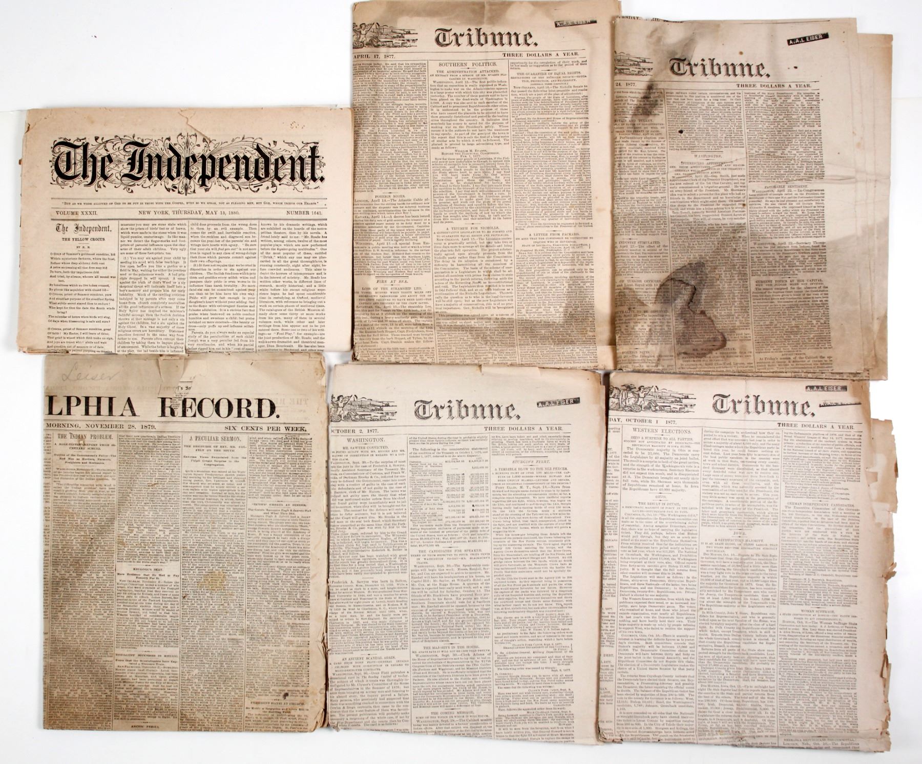 Six newspapers involving Indian surrenders in the aftermath of the Little Big Horn, where US troops infiltrated the countryside from Montana to Canada, looking for Sitting Bull, Crazy Horse, and any other Indian leaders who they felt represented a threat to the US. 10.1.77, New York trib, Chief Joseph Surrenders; 4.24.77 New York Trib, Cheyenne Surrender; 4.17.77 New York Trib, One Who Touches the Clouds Band Surrenders; Oct 2, 1877 New York Trib, Nez Perces defeat; 11.28.79, Philadelphia Record "The Indian Problem"; 5.18.80, New York Independent, Ponca Indian removal.