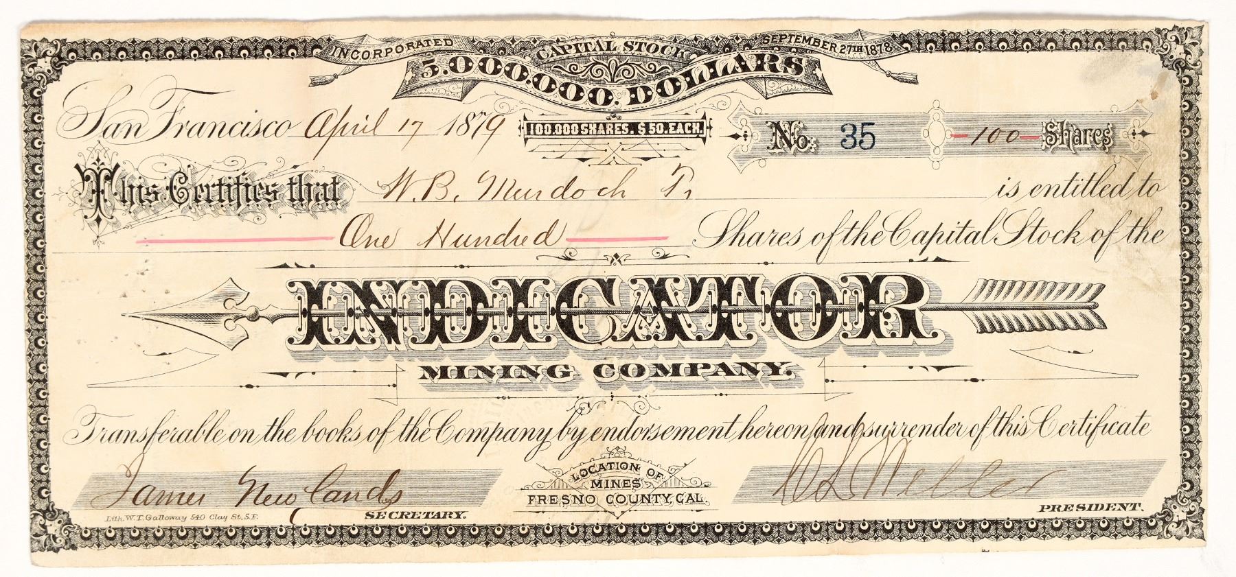 "Location of Mine Fresno County, Cal." (printed at bottom center). No. 35, issued for 100 shares to WB Murdoch in 1879 in San Francisco. Signed by president Weller and secretary Newlands. Not cancelled. Many folds and creases, pinholes, some soiling. 4 x 9" In July 1879, it was reported they were working hard on their tunnel and with "fine prospects" (Fresno Republican, July 5, 1879).