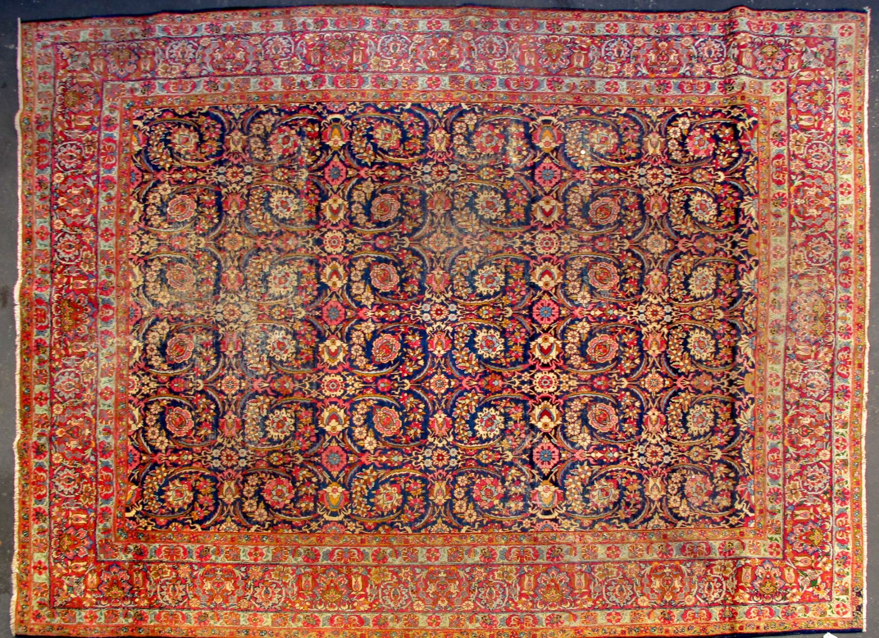 Kerman carpets (sometimes "Kirman") are one of the traditional classifications of Persian carpets. They are named after Kerman, which is both a city and a province located in south central Iran, though, as with other such designations the term describes a type which may have been made elsewhere. Kerman has been a major center for the production of high quality carpets since at least the 15th century. In the 18th century, some authors considered the carpets from the province of Kerman, especially at Siftan, to be the finest of all Persian carpets, partly because of the high quality of the wool from the region, known as Carmania wool. In the world of antique Persian rugs, Kerman carpets are celebrated as being among the best. Kerman rugs are prized by collectors for many reasons, including a wide range of designs, a broad palette, use of natural dyes and fibers, great tensile strength and abrasion resistance, and expert color combinations. No two Kerman rugs are precisely alike, but these general characteristics typify this enduringly popular style. This carpet is in very nice condition, & has vibrant color, exceptionally beautiful. 11'8" x 8'10". . Ben-Tcahvtchavadze Collection of Ontario, Canada